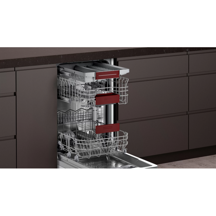 Современная узкая встраиваемая посудомоечная машина Neff S857ZMX09E сочетает в себе инновационные технологии, продуманный дизайн и высокую функциональность. Модель выполнена в стильном корпусе из нержавеющей стали и предназначена для полного встраивания в кухонную мебель. Габариты устройства (81.5 × 44.8 × 55 см) позволяют удобно разместить его даже в компактном пространстве.