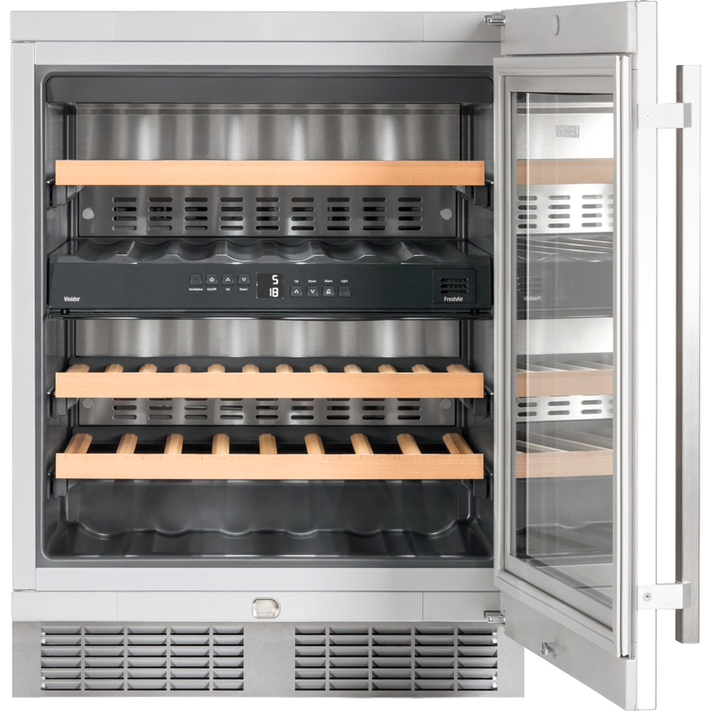 Температура хранения вина устанавливается на панели управления, а цифровой индикатор покажет действительную температуру с точностью до градуса. Звуковая и визуальная сигнализация информирует об открытой двери и/или изменении температуры внутри винного шкафа. Панель управления оснащена функцией блокировки, чтобы избежать изменения параметров настройки детьми.
