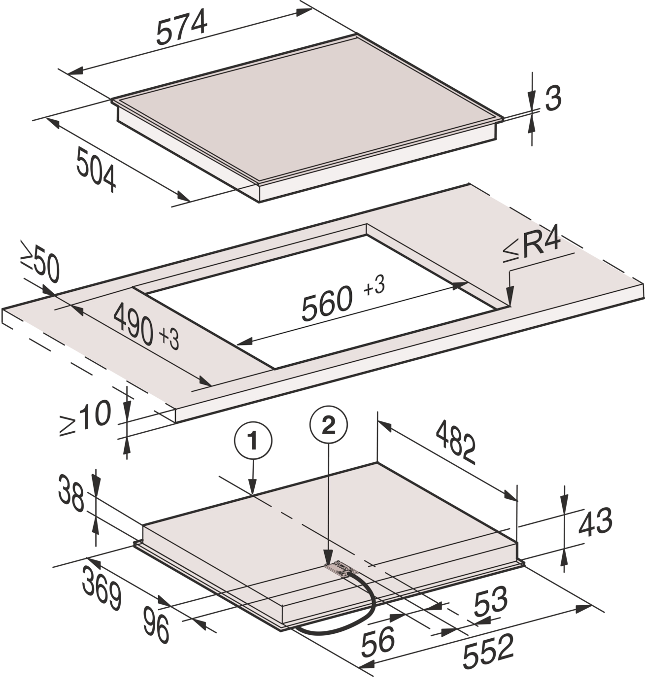 Габариты ниши (Ш x Г): 570/596 х 470/496 мм (вырез ступенькой)