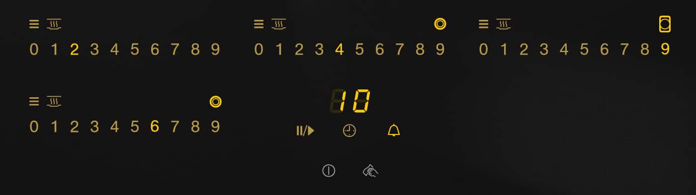 Управление SmartSelect с желтой подсветкой, выбором мощности на цифровой шкале для каждой конфорки, c опцией WipeProtection