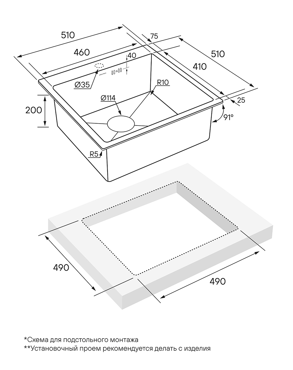 Оптимальный размер мойки 510х51 0мм подходит для любого кухонного пространства. Возможен монтаж вровень со столешницей или врезной монтаж мойки.