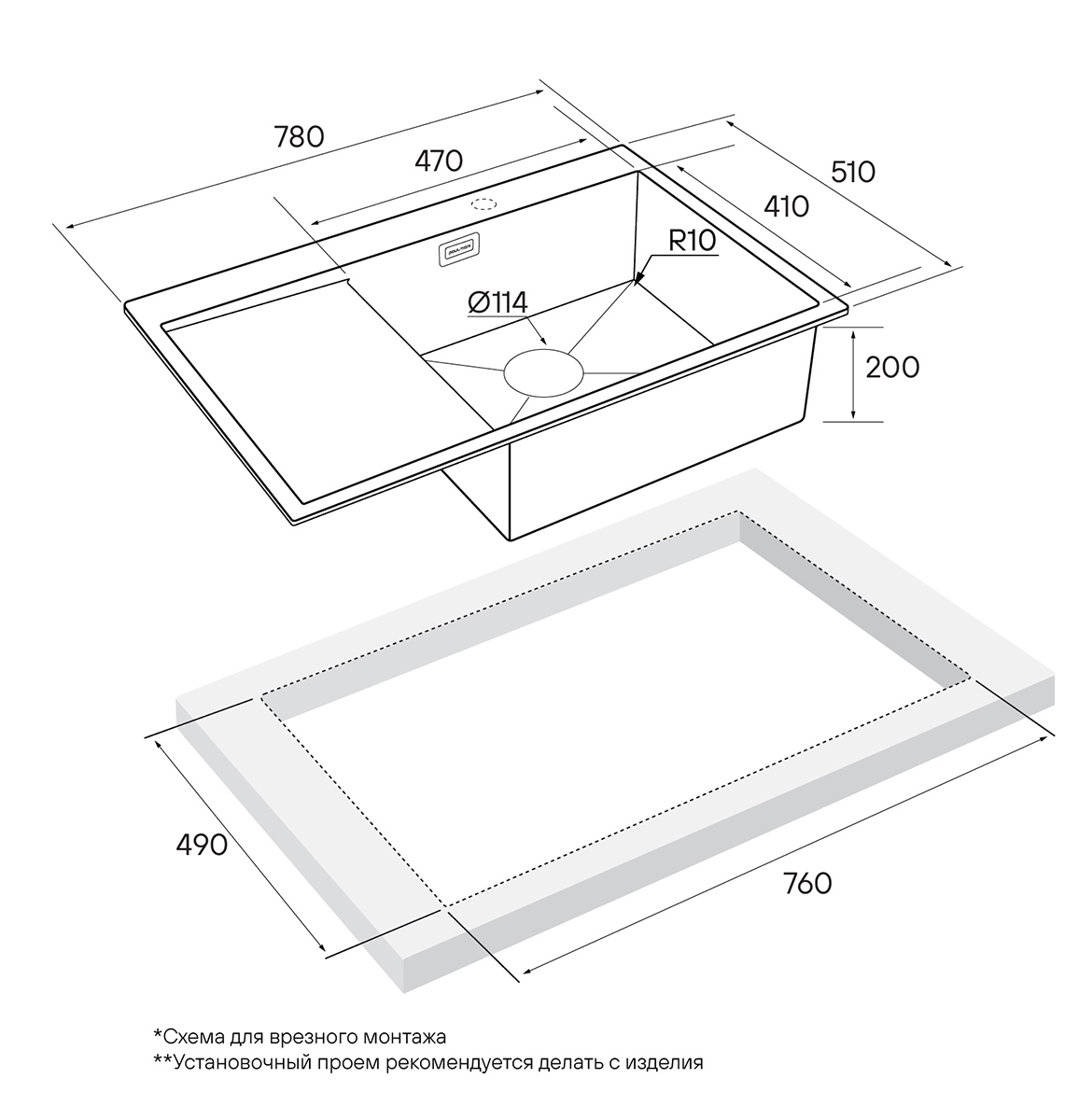 Габариты мойки составляют 780x510 мм, функциональное плоское крыло мойки может служить дополнительной рабочей поверхностью. Возможен монтаж вровень со столешницей или врезной монтаж мойки.