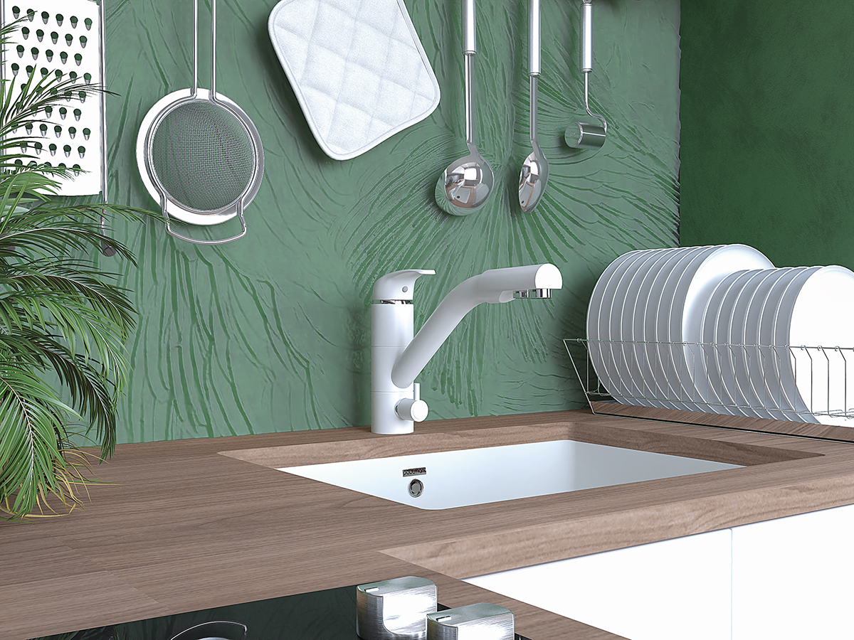 предусматривает поступление фильтрованной воды, которая не смешивается с водопроводной. Питьевая вода подается через отдельные трубку и аэратор, а для регулирования питьевой воды предусмотрена отдельная ручка.
