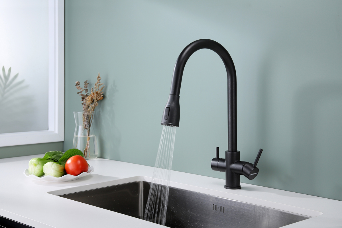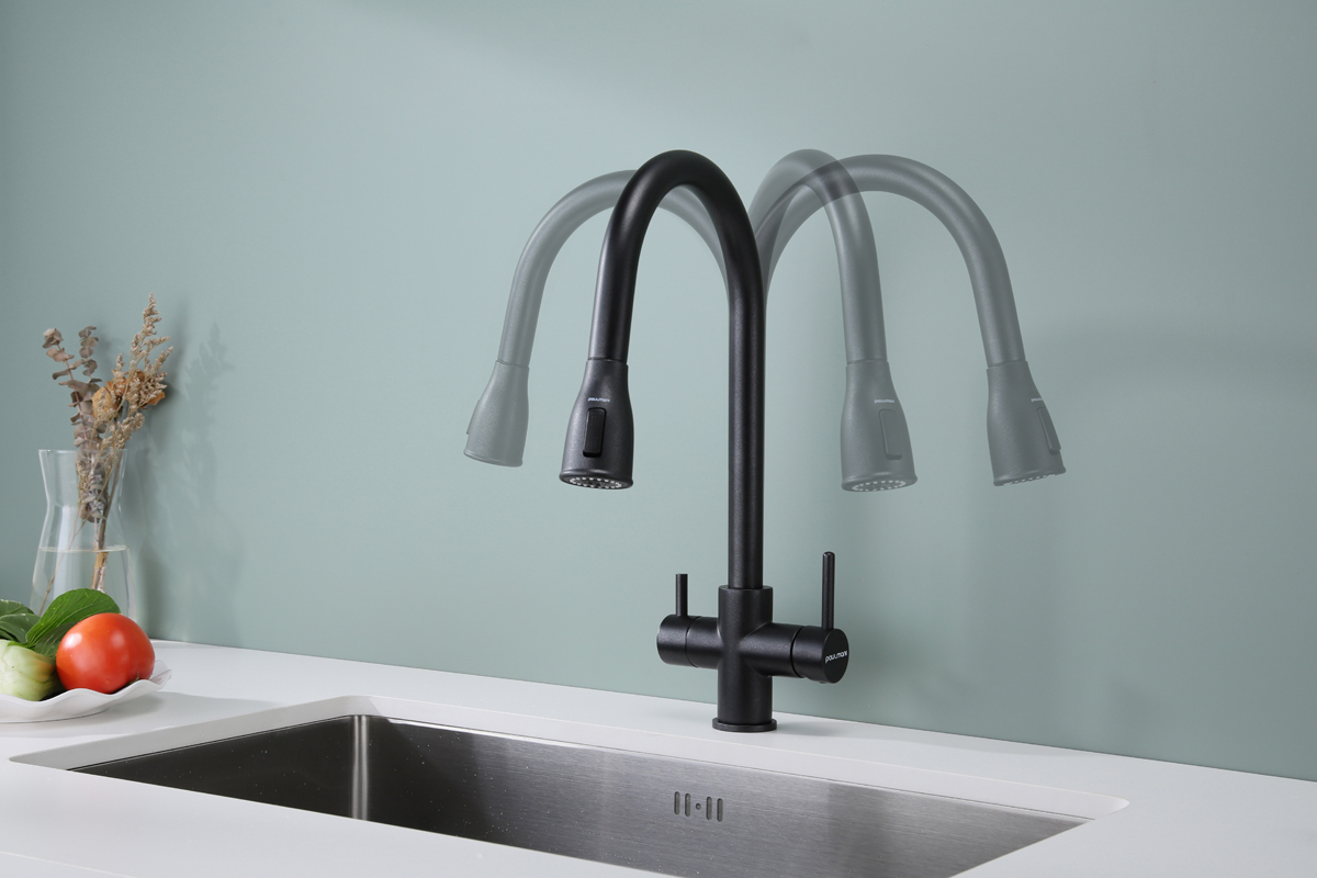 Смеситель LANGE оснащен функциями подключения фильтра питьевой воды, выдвижения излива и двумя режимами подачи водопроводной воды: струя и душ.