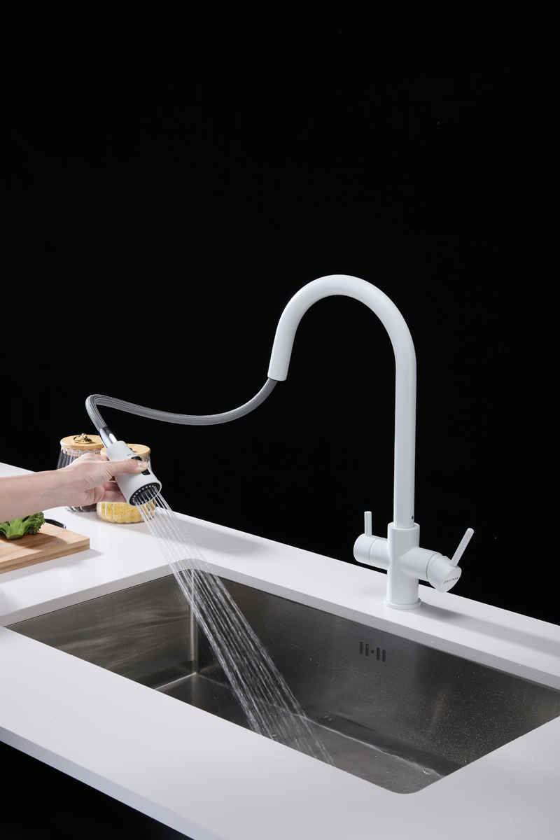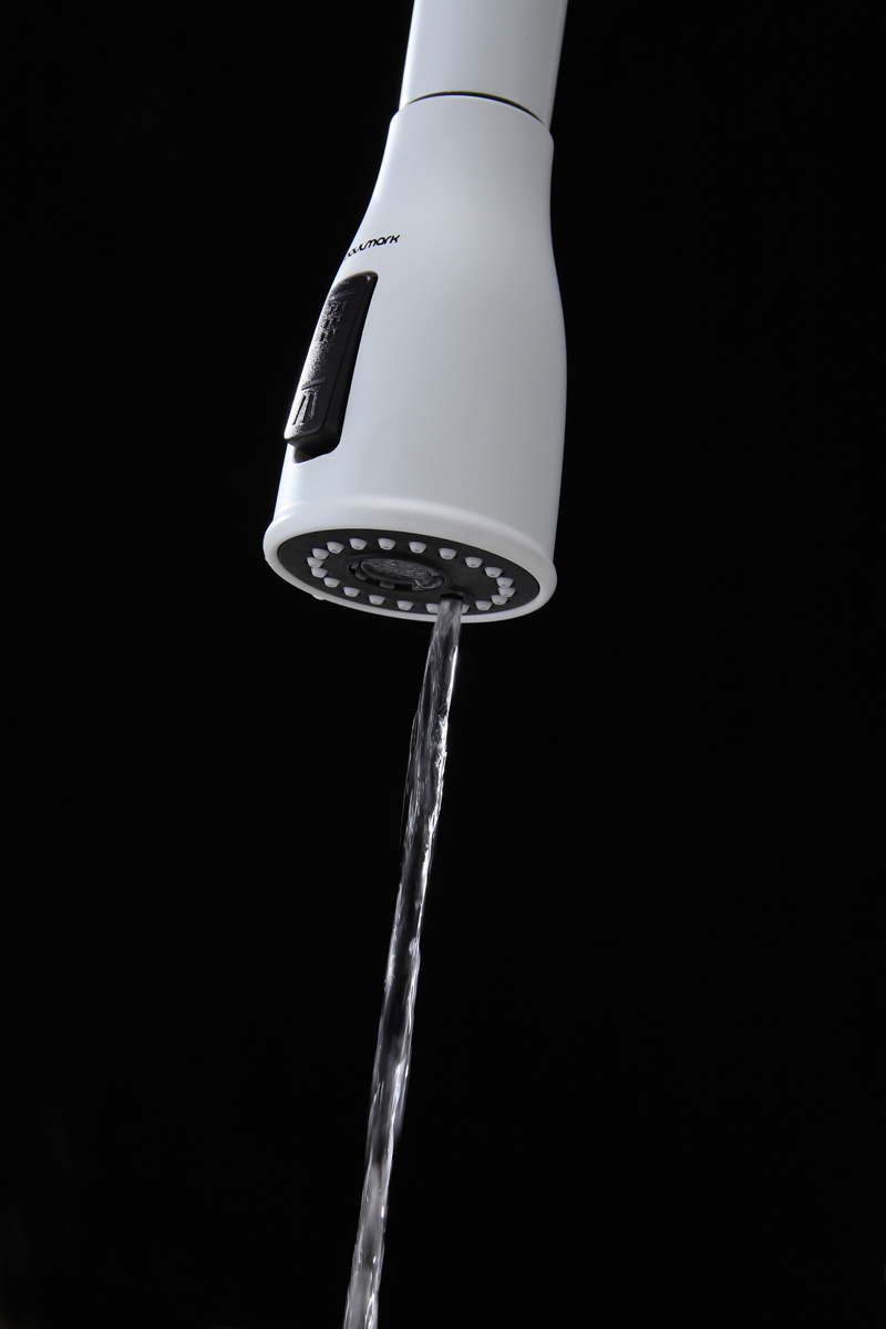 Смеситель LANGE оснащен функциями подключения фильтра питьевой воды, выдвижения излива и двумя режимами подачи водопроводной воды: струя и душ.