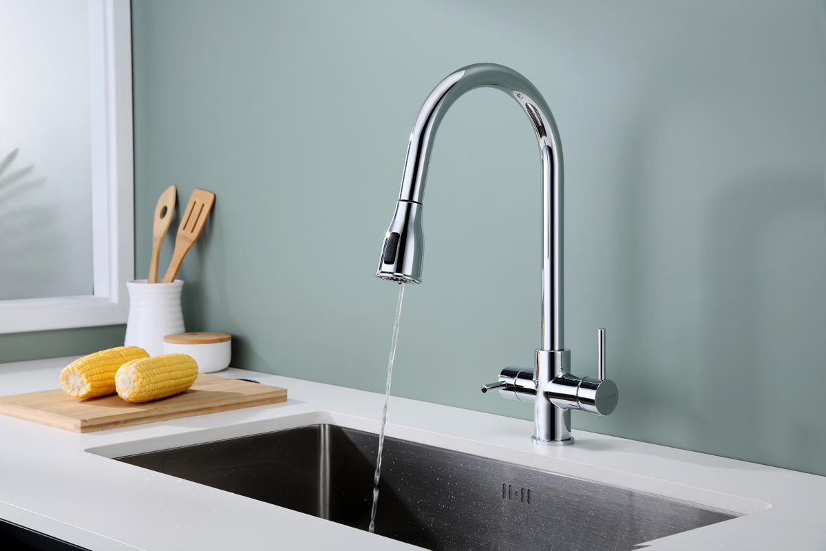 Смеситель LANGE оснащен функциями подключения фильтра питьевой воды, выдвижения излива и двумя режимами подачи водопроводной воды: струя и душ.