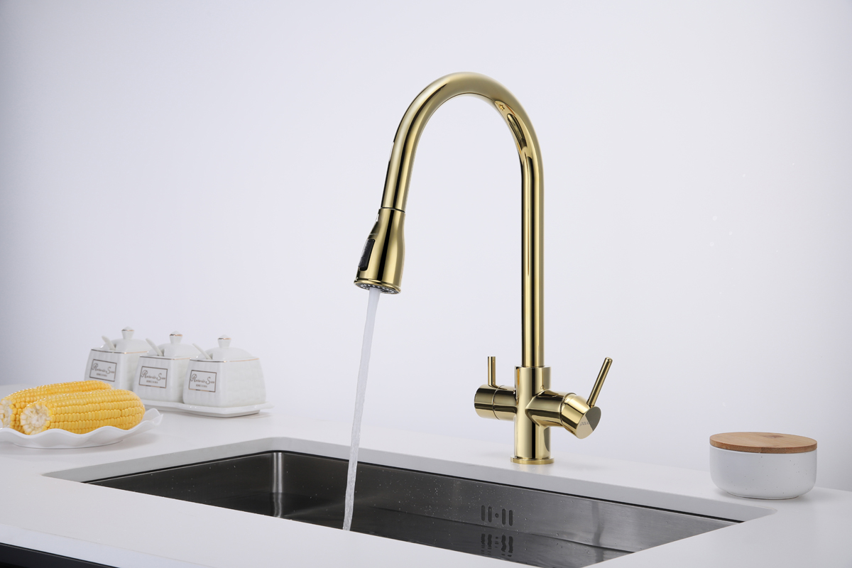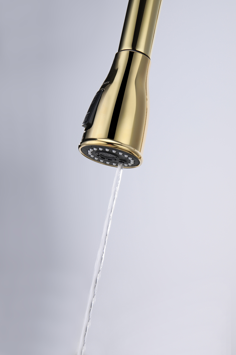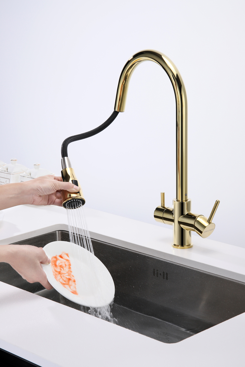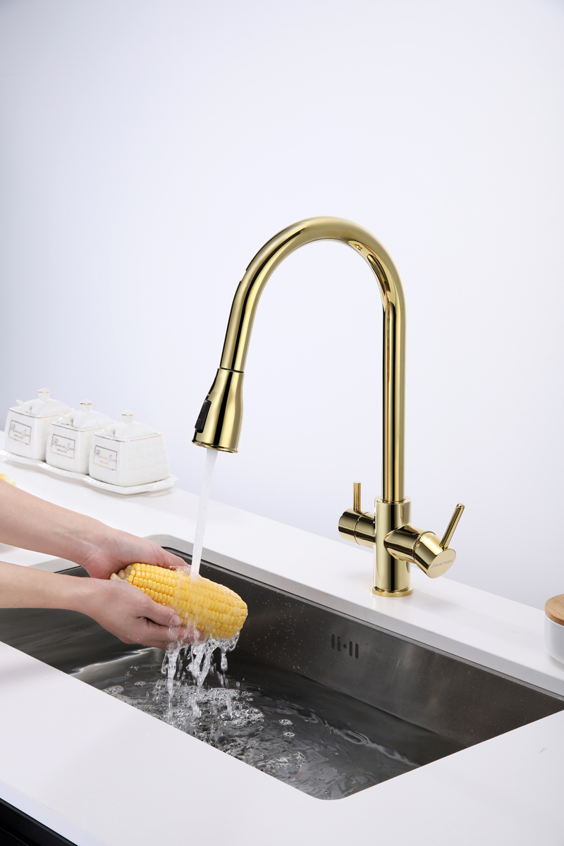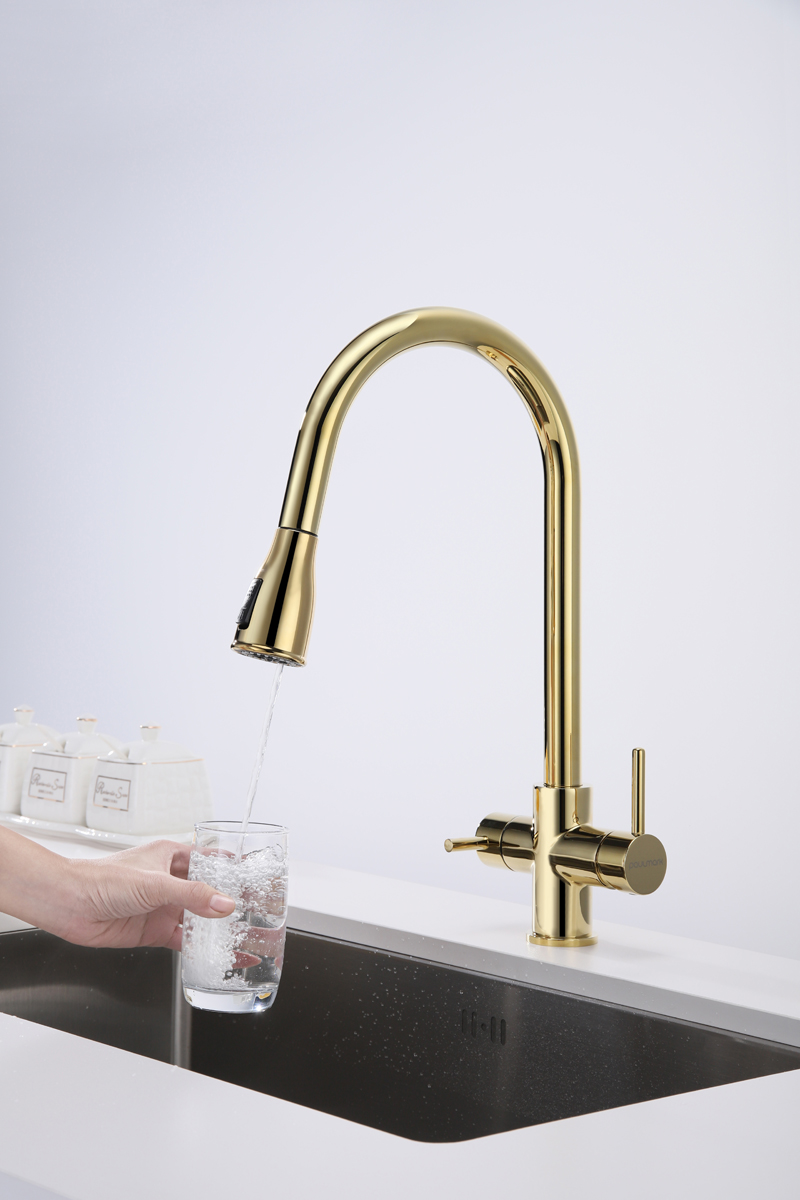Смеситель LANGE оснащен функциями подключения фильтра питьевой воды, выдвижения излива и двумя режимами подачи водопроводной воды: струя и душ.
