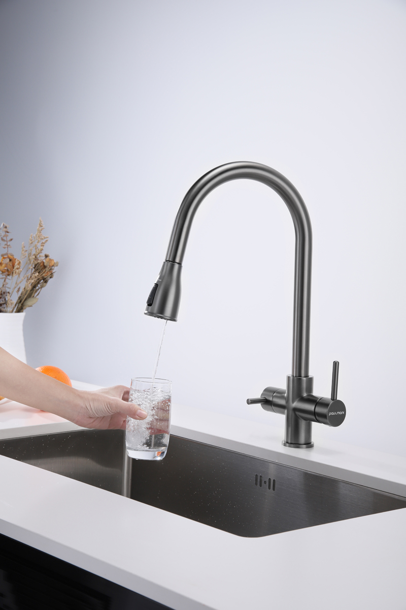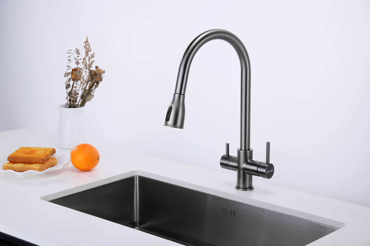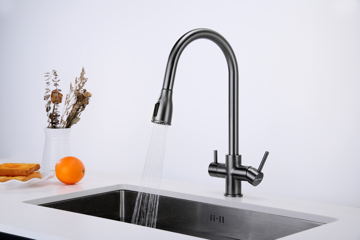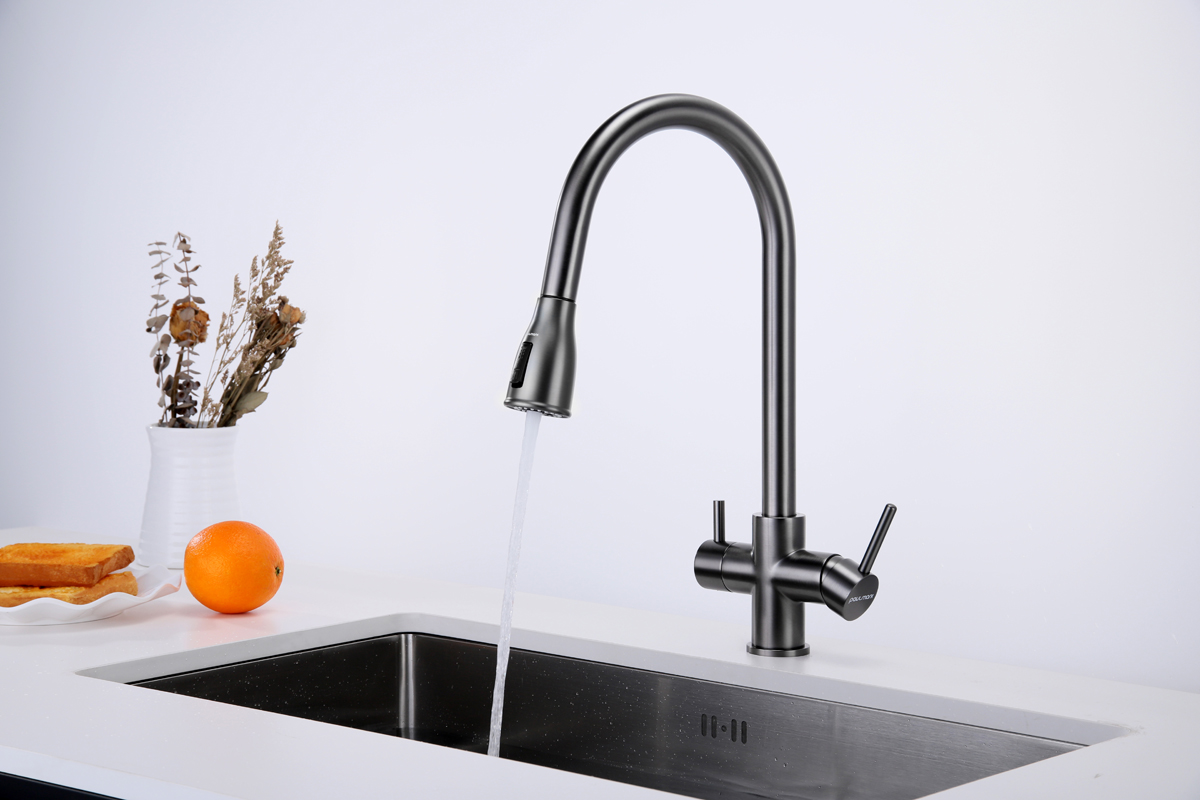 Смеситель LANGE оснащен функциями подключения фильтра питьевой воды, выдвижения излива и двумя режимами подачи водопроводной воды: струя и душ.