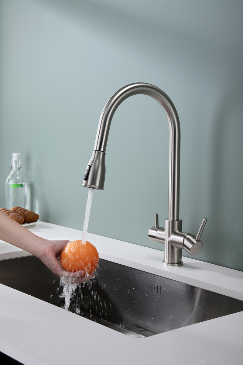 Смеситель LANGE оснащен функциями подключения фильтра питьевой воды, выдвижения излива и двумя режимами подачи водопроводной воды: струя и душ.