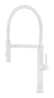 Излив смесителя выполнен из высокопрочного силикона. Конструкцией предусмотрен магнитный механизм фиксации излива.