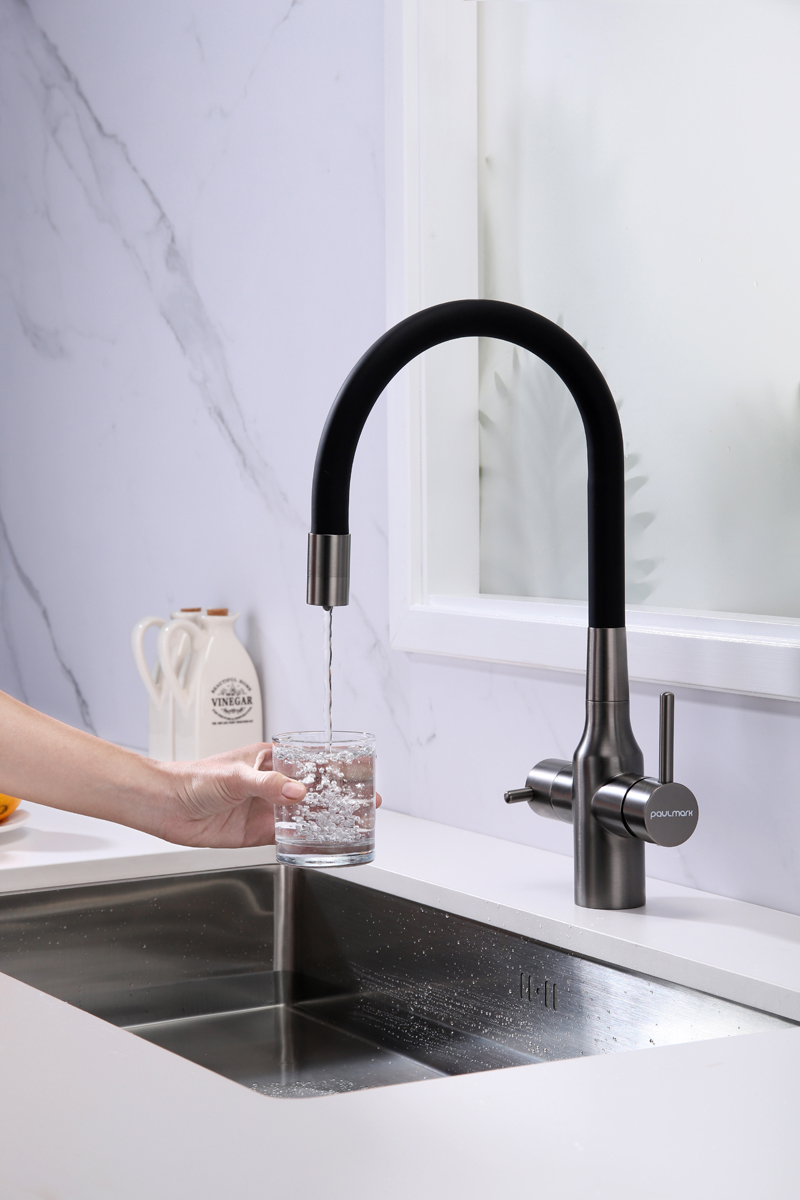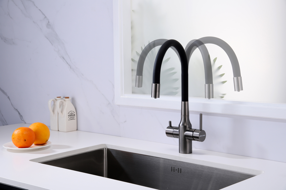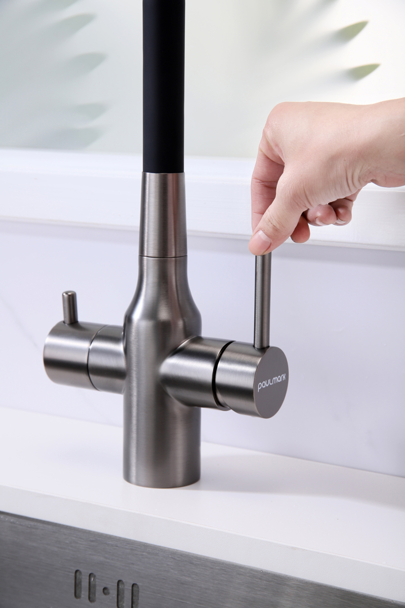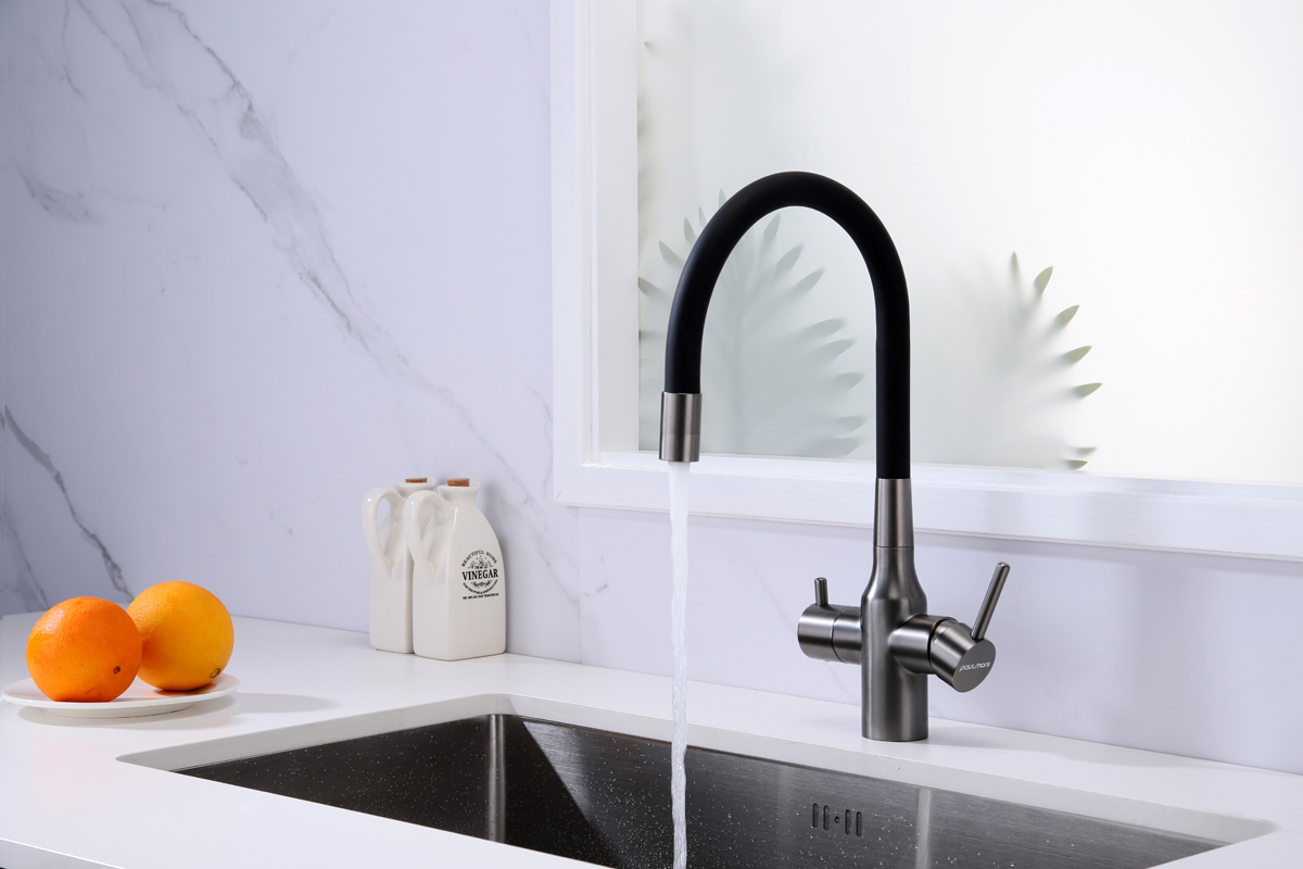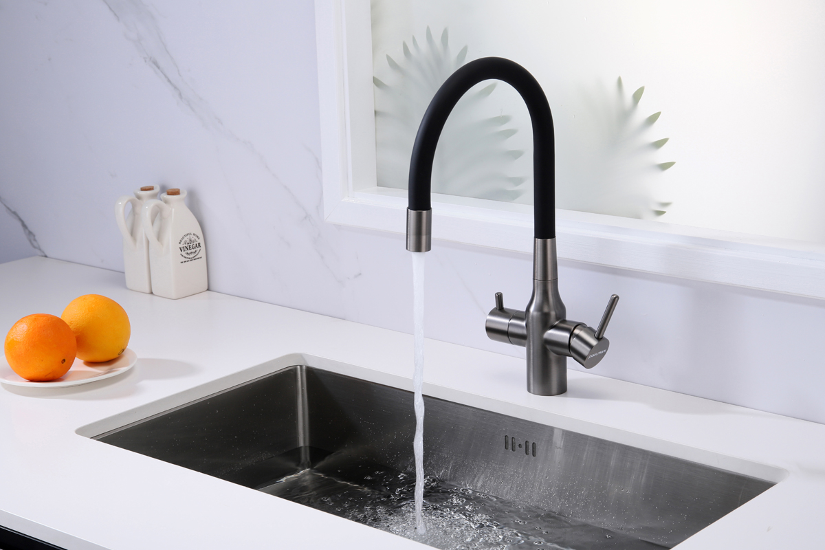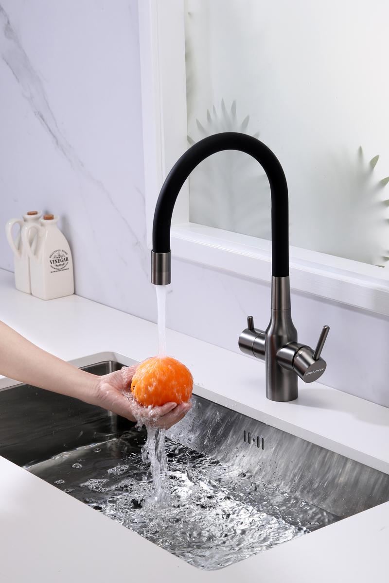 Смеситель для кухни SALIX c возможностью подключения системы фильтрации питьевой воды изготовлен из высококачественной латуни, которая отвечает высочайшим европейским стандартам качества, не содержит свинца, не разрушается со временем и безопасна для здоровья.