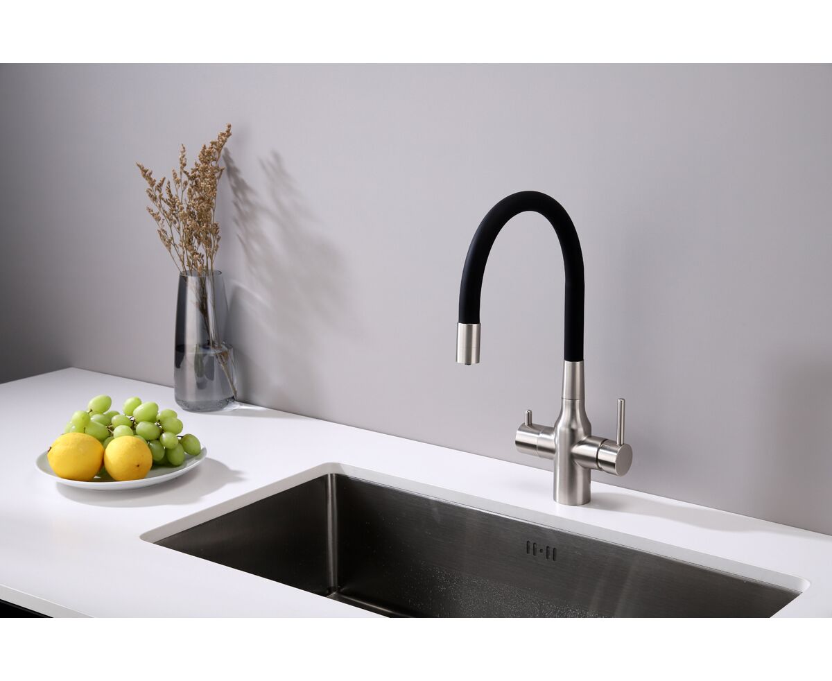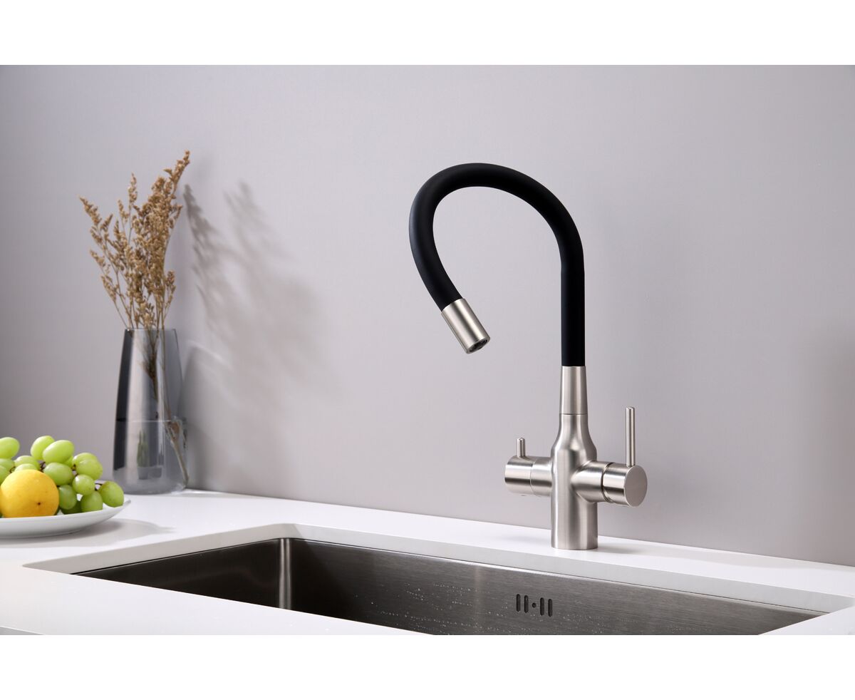 Смеситель для кухни SALIX c возможностью подключения системы фильтрации питьевой воды изготовлен из высококачественной латуни, которая отвечает высочайшим европейским стандартам качества, не содержит свинца, не разрушается со временем и безопасна для здоровья.