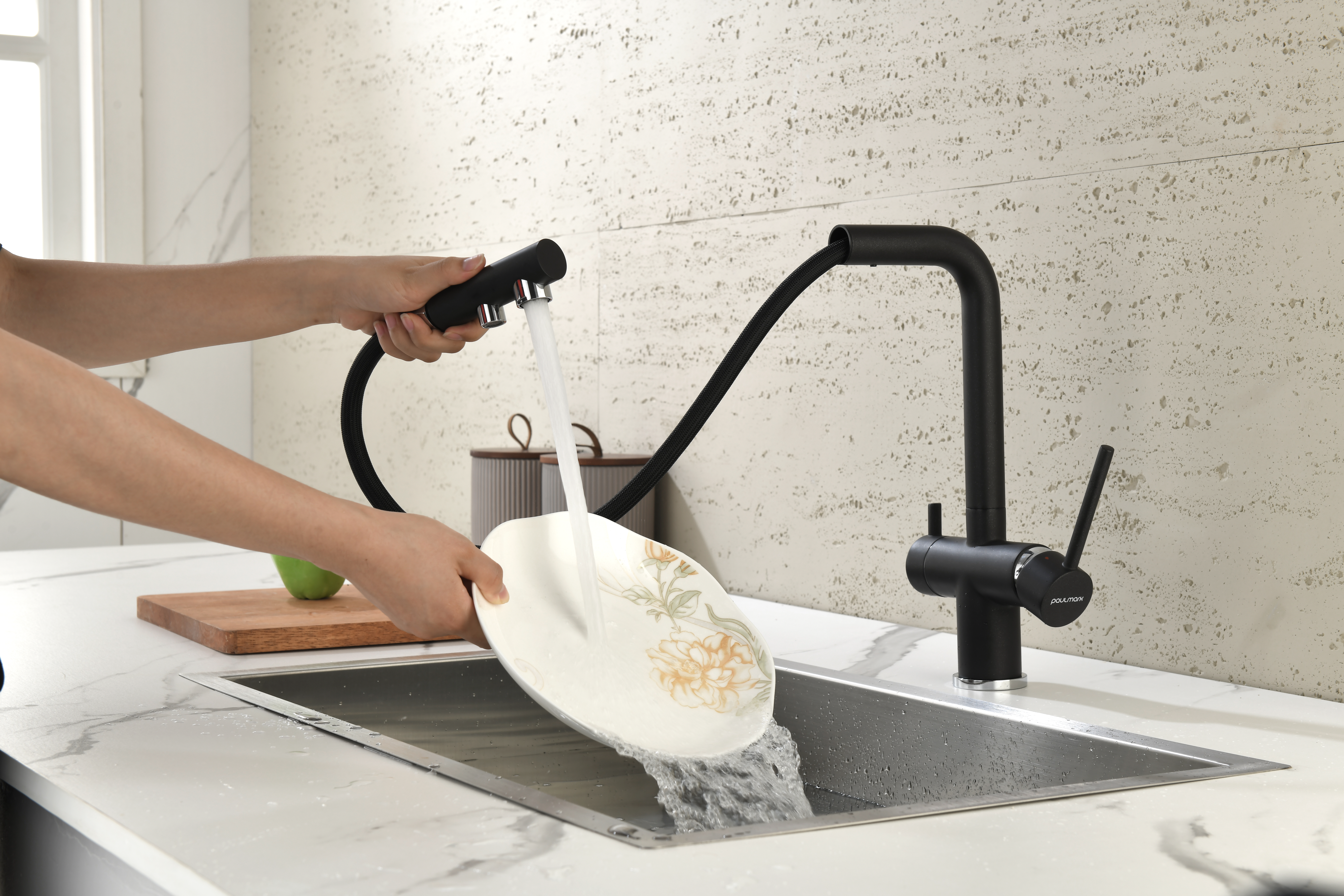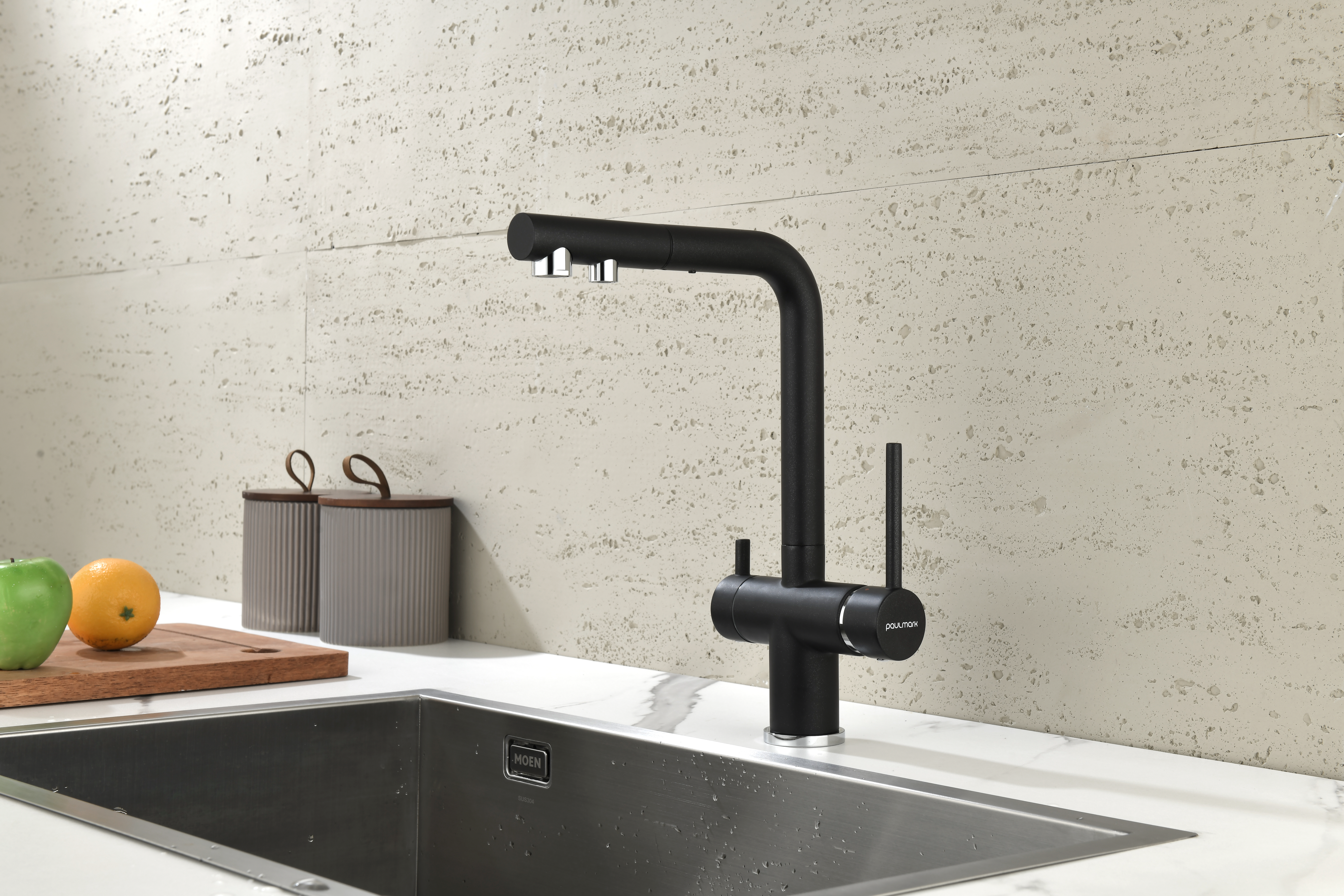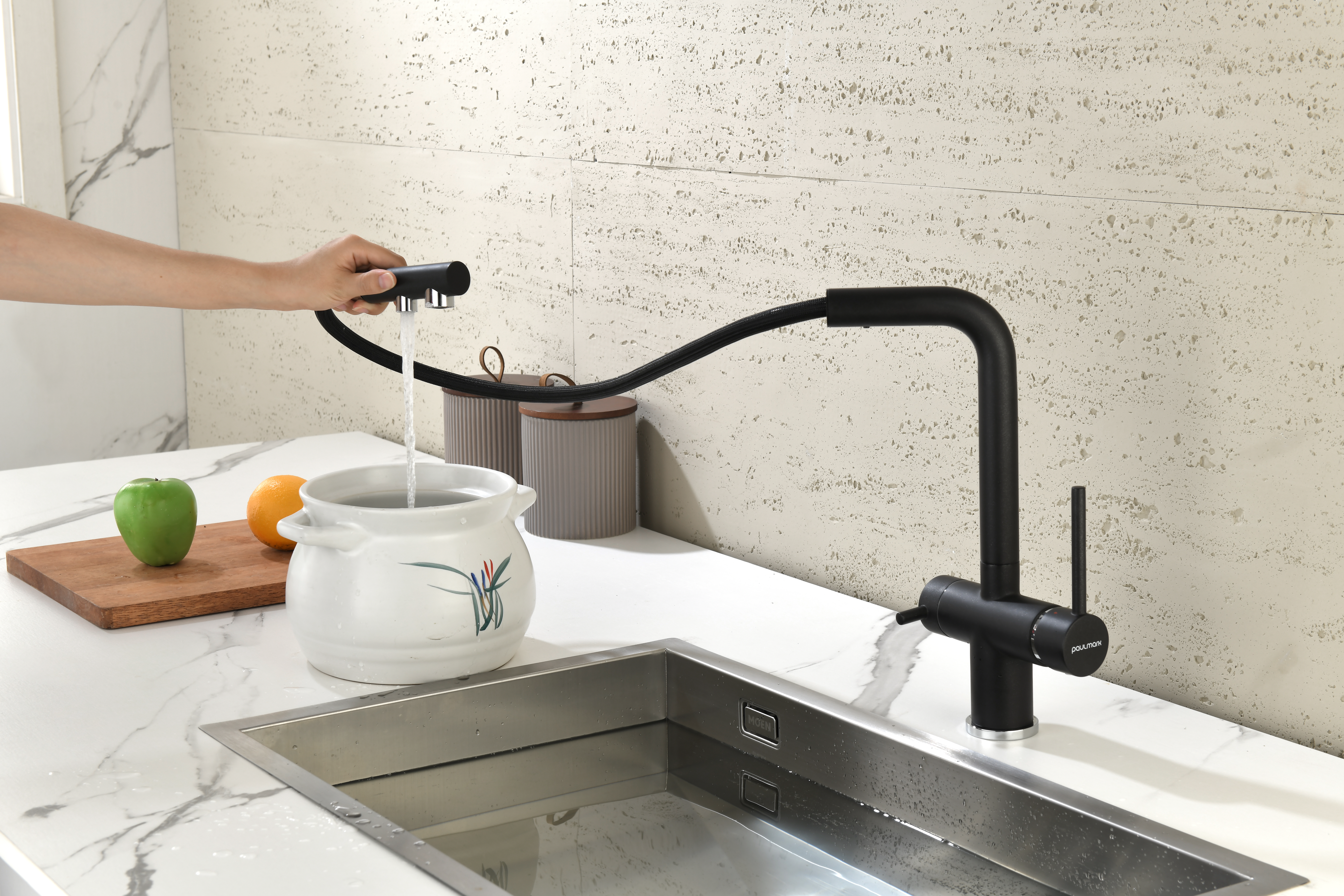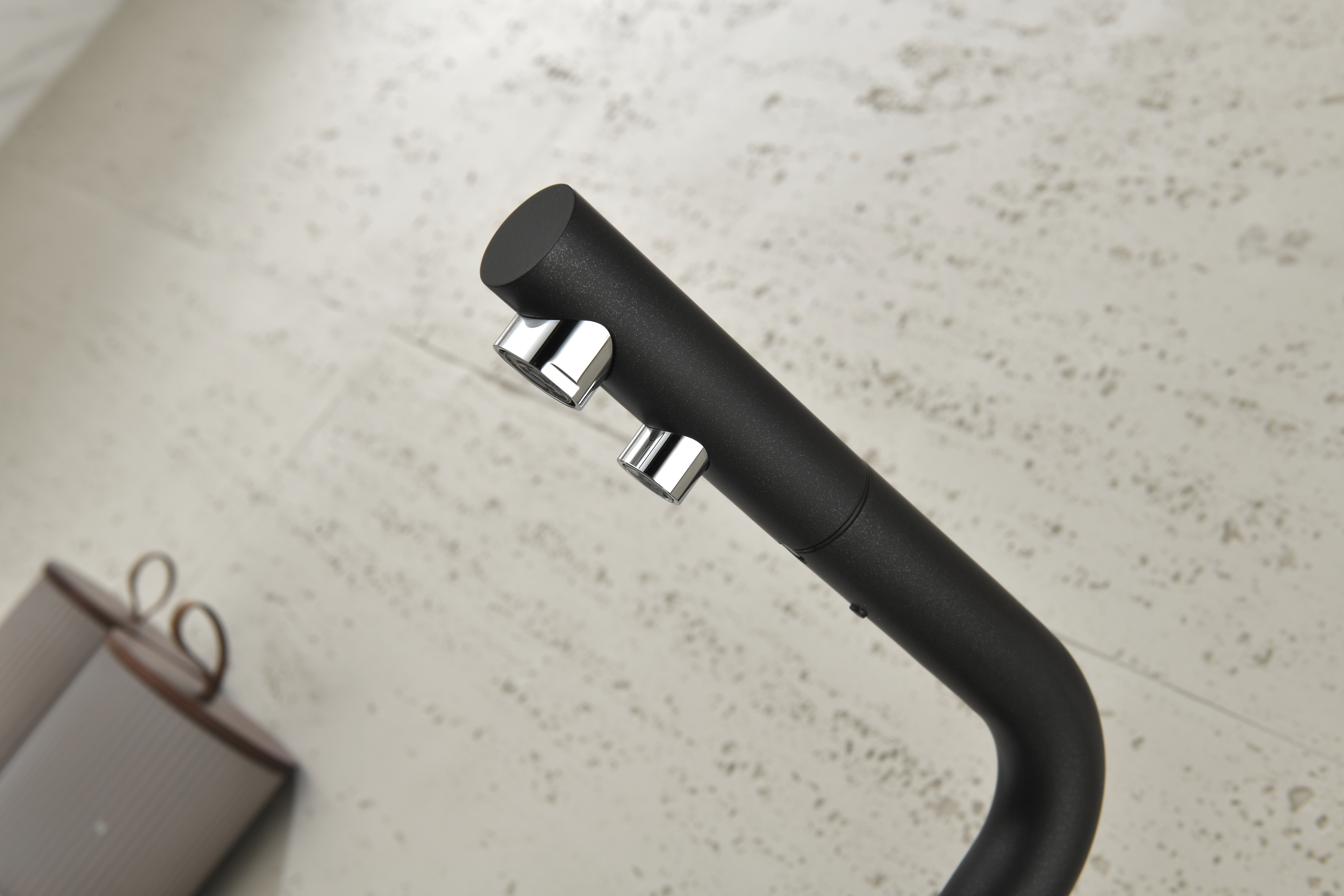 Смеситель оснащен гибким выдвижным изливом из нейлоновой оплетки, которая обладает отличной устойчивостью к истиранию и разрушению. Данная техническая особенность расширяет рабочую зону смесителя, позволяя пользоваться им с удобством в больших мойках, мойках с двумя чашами, или наполнять водой ёмкость на столе рядом с мойкой, в том числе питьевой водой.