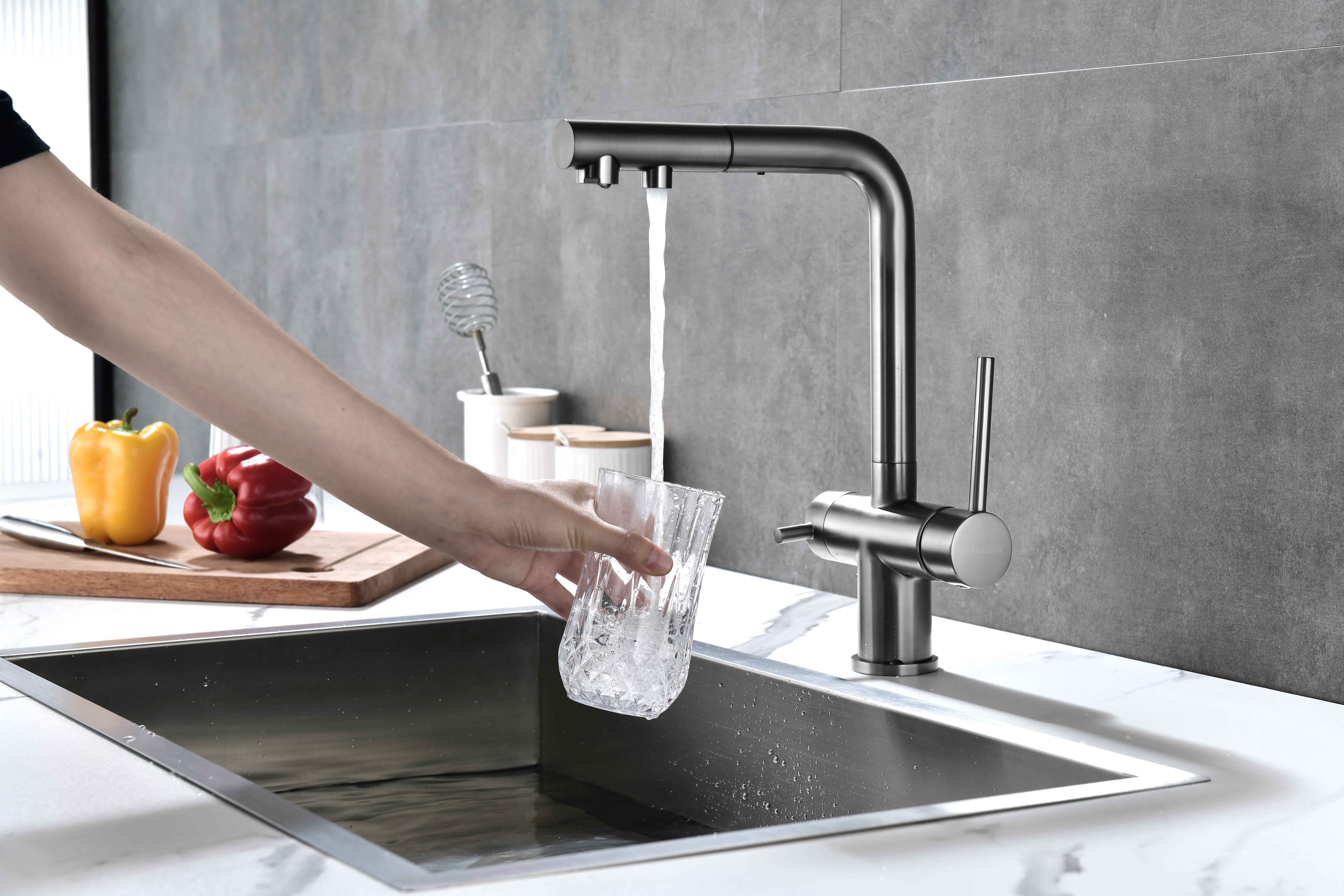 SERPENTINE оснащён функцией TRINKWASSER - излив смесителя имеет встроенный независимый канал для питьевой воды из фильтра, таким образом питьевая и водопроводная вода не смешиваются. Управление питьевой водой осуществляется отдельным рычагом, расположенным слева. Для пуска водопроводной воды используется большой рычаг справа.