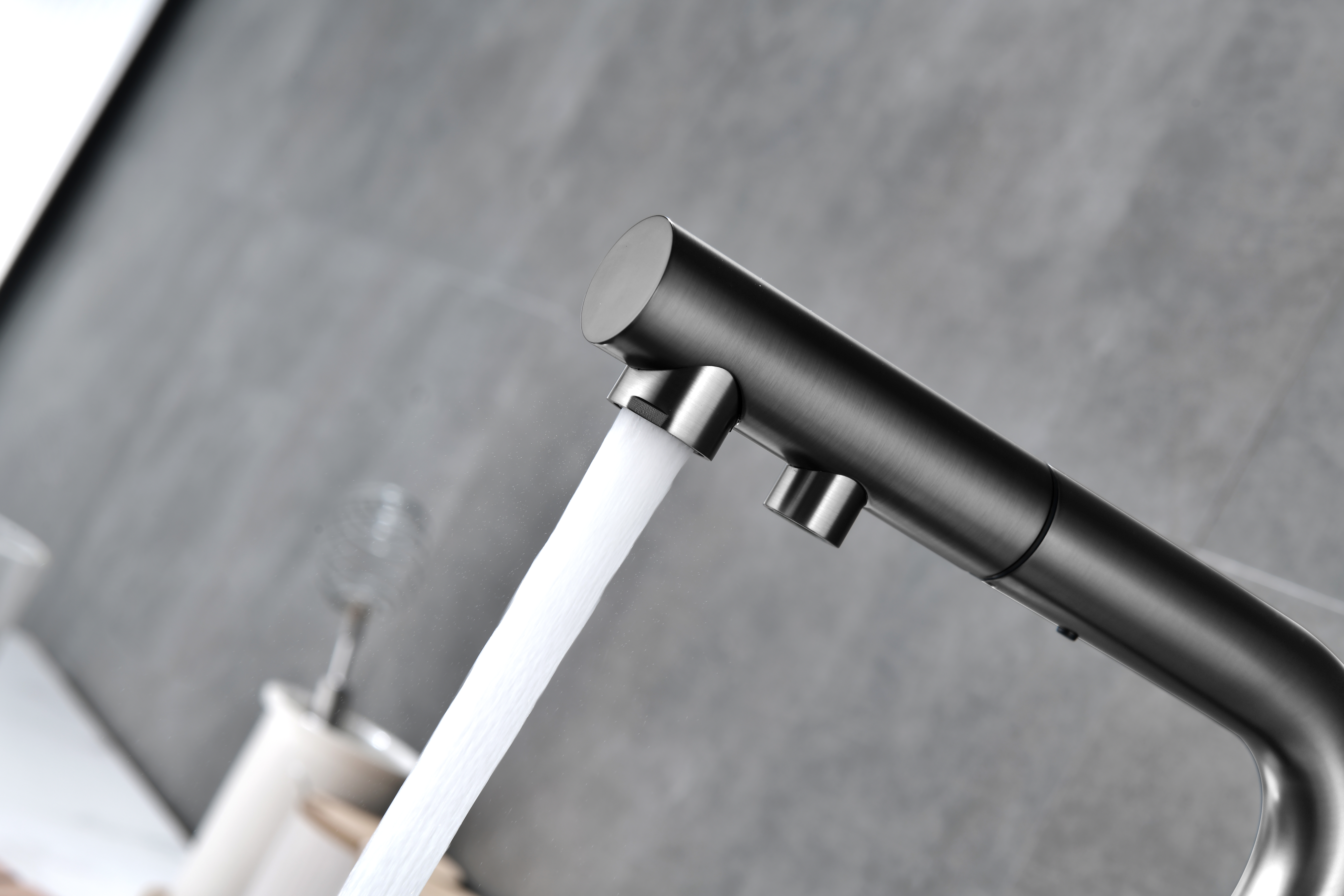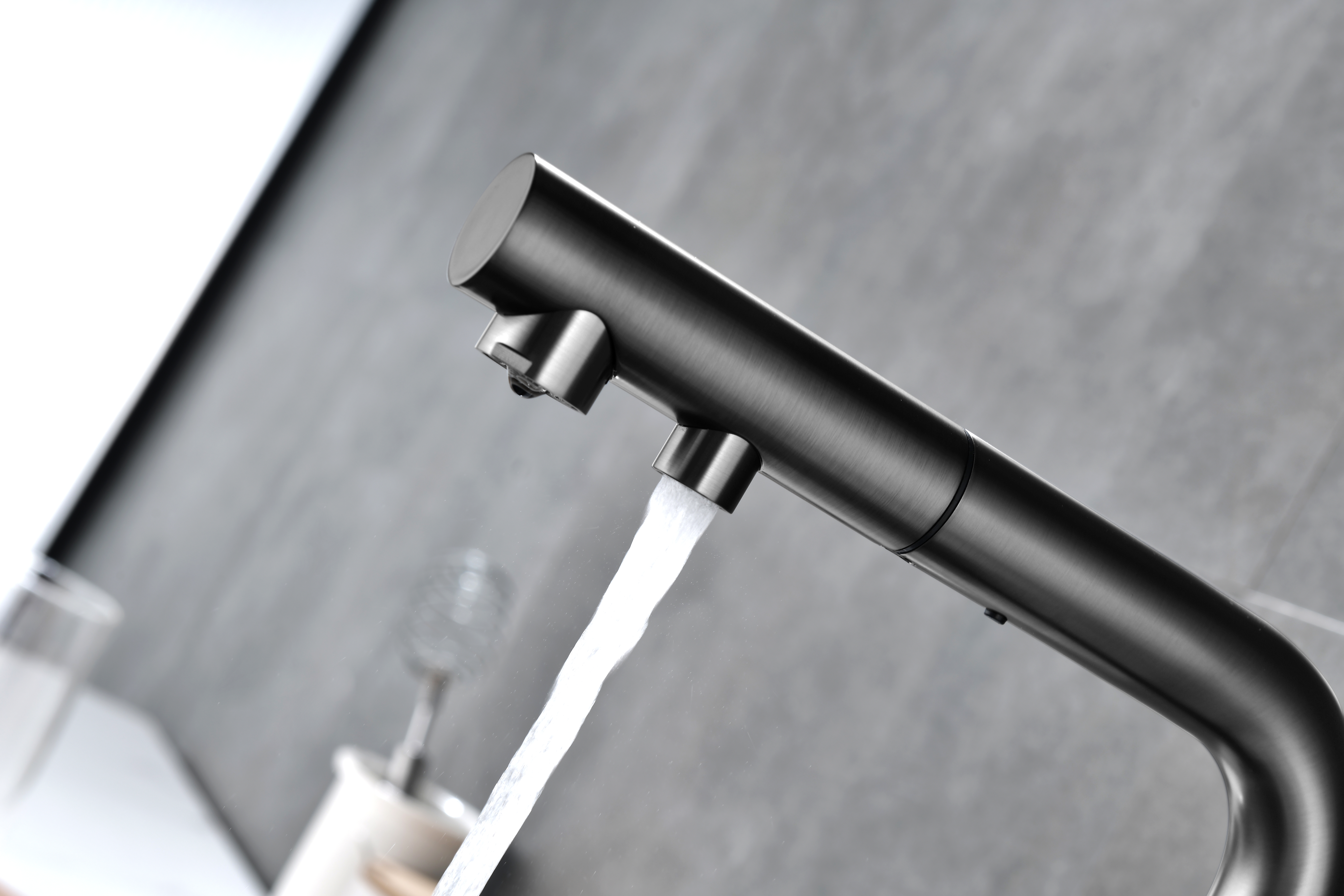 Смеситель оснащен гибким выдвижным изливом из нейлоновой оплетки, которая обладает отличной устойчивостью к истиранию и разрушению. Данная техническая особенность расширяет рабочую зону смесителя, позволяя пользоваться им с удобством в больших мойках, мойках с двумя чашами, или наполнять водой ёмкость на столе рядом с мойкой, в том числе питьевой водой.