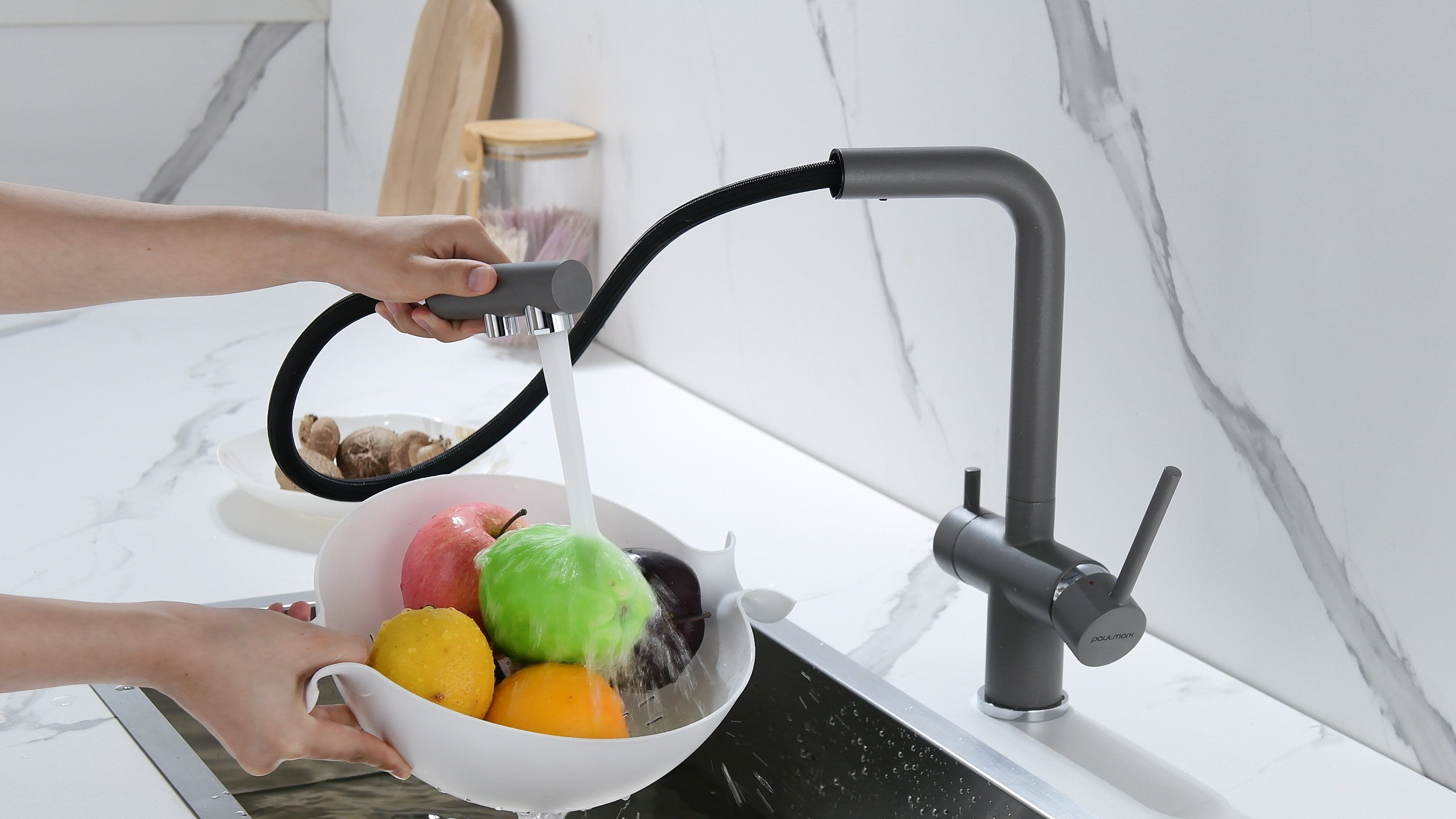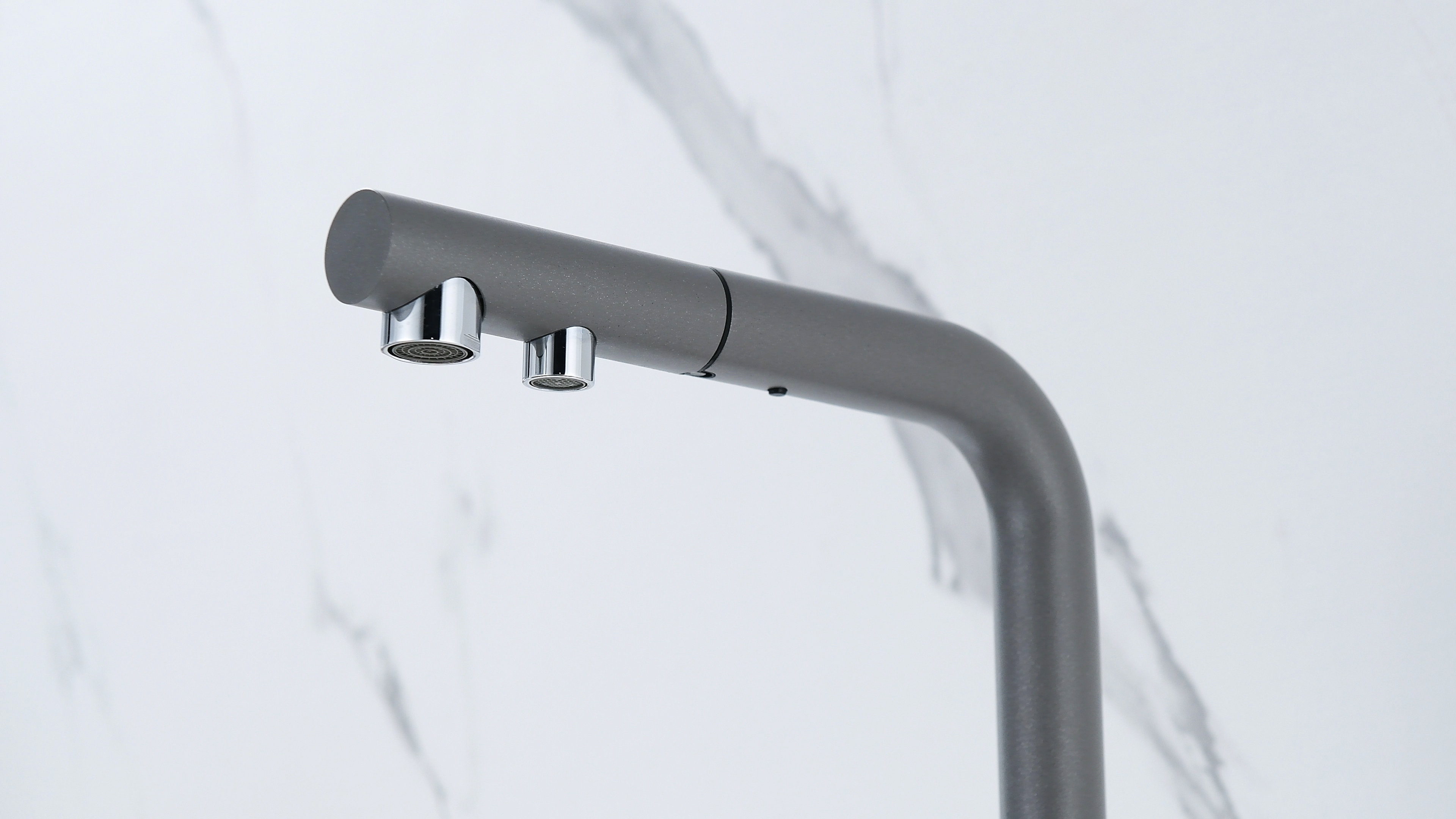 Смеситель оснащен гибким выдвижным изливом из нейлоновой оплетки, которая обладает отличной устойчивостью к истиранию и разрушению. Данная техническая особенность расширяет рабочую зону смесителя, позволяя пользоваться им с удобством в больших мойках, мойках с двумя чашами, или наполнять водой ёмкость на столе рядом с мойкой, в том числе питьевой водой.