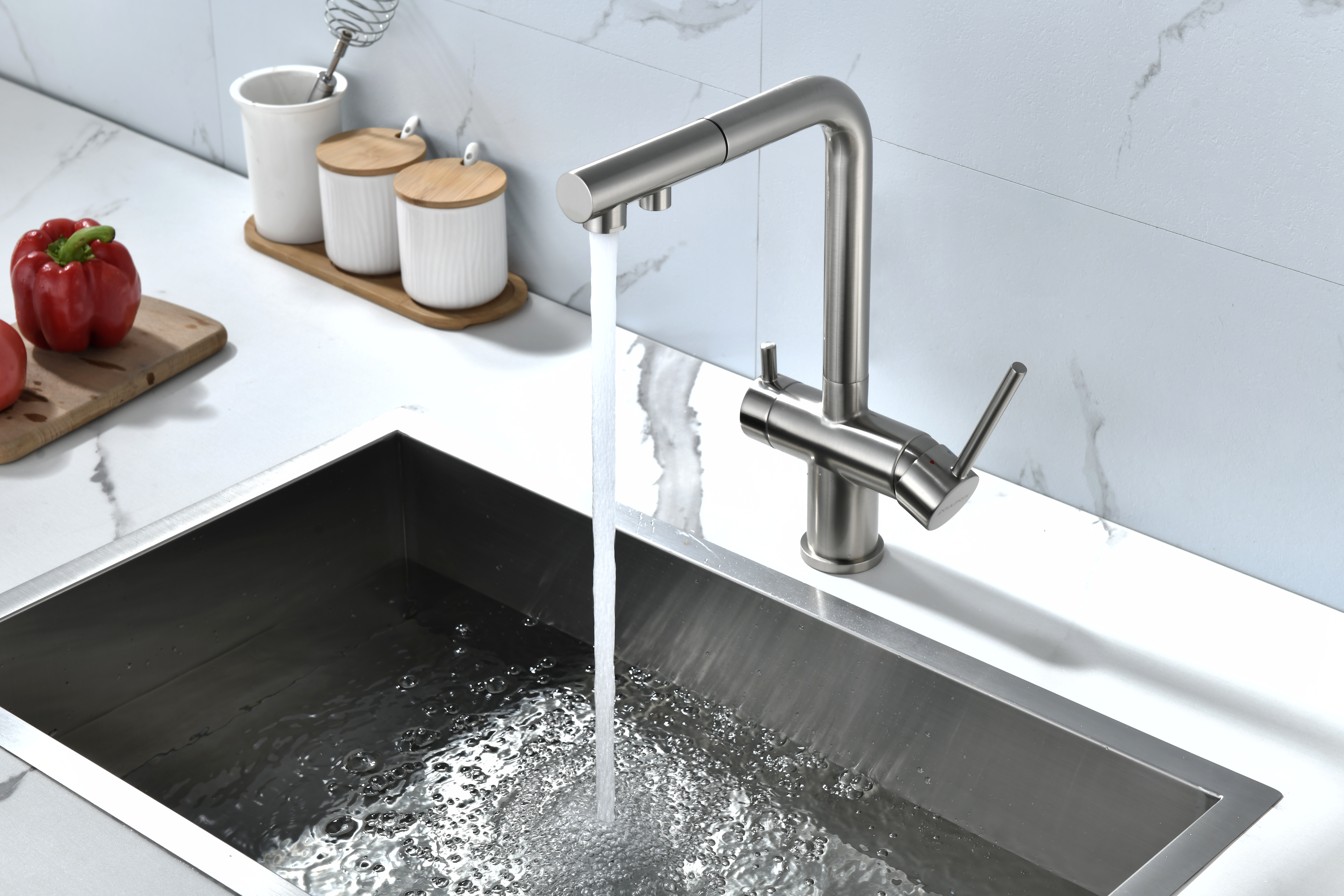 Смеситель оснащен гибким выдвижным изливом из нейлоновой оплетки, которая обладает отличной устойчивостью к истиранию и разрушению. Данная техническая особенность расширяет рабочую зону смесителя, позволяя пользоваться им с удобством в больших мойках, мойках с двумя чашами, или наполнять водой ёмкость на столе рядом с мойкой, в том числе питьевой водой.