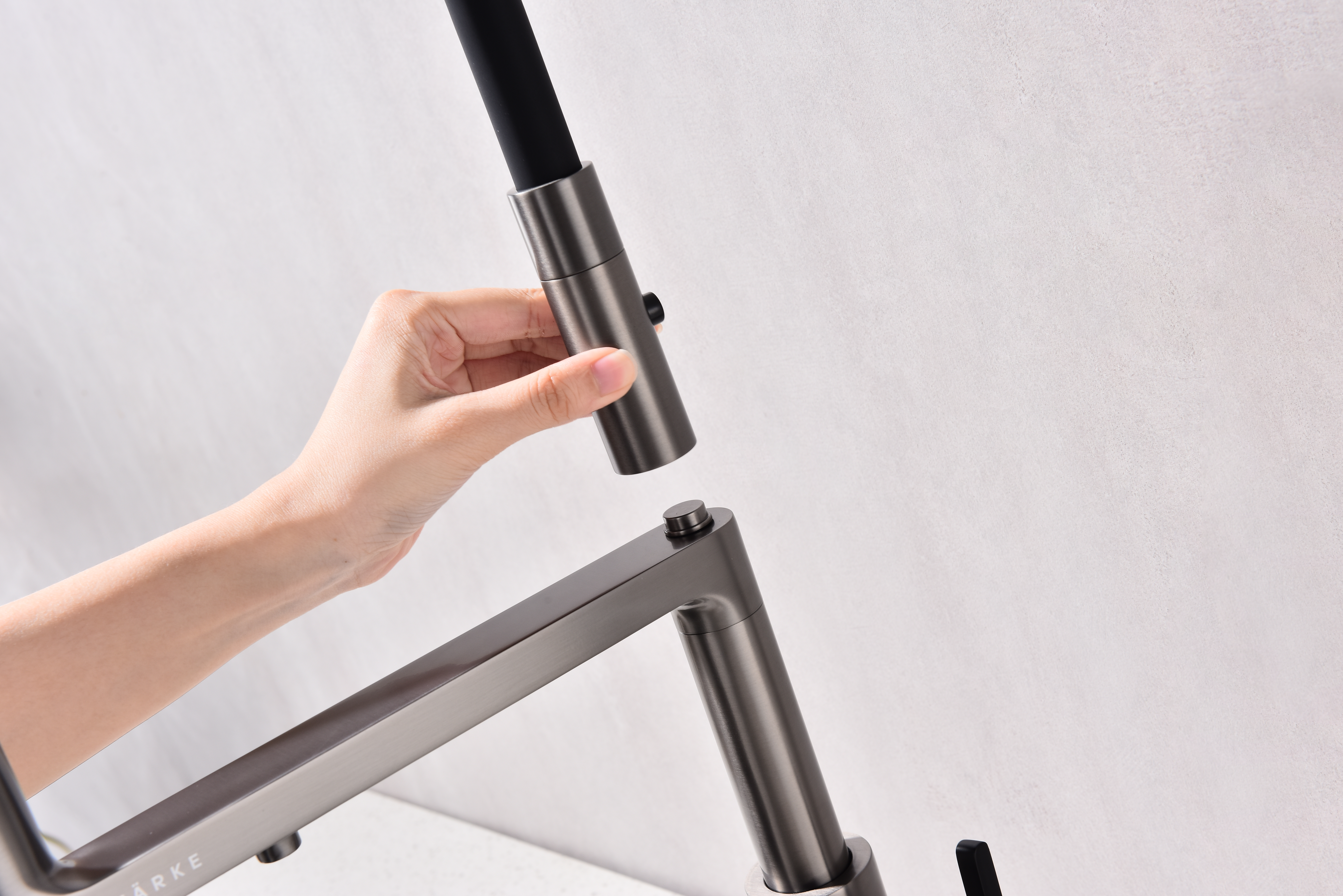 Гибкий силиконовый излив оснащен функцией деликатного душа и магнитным механизмом фиксации в задней части латунного корпуса. Он позволяет ополоснуть посуду или мойку в любой ее части или наполнить емкости даже на столе рядом с мойкой.