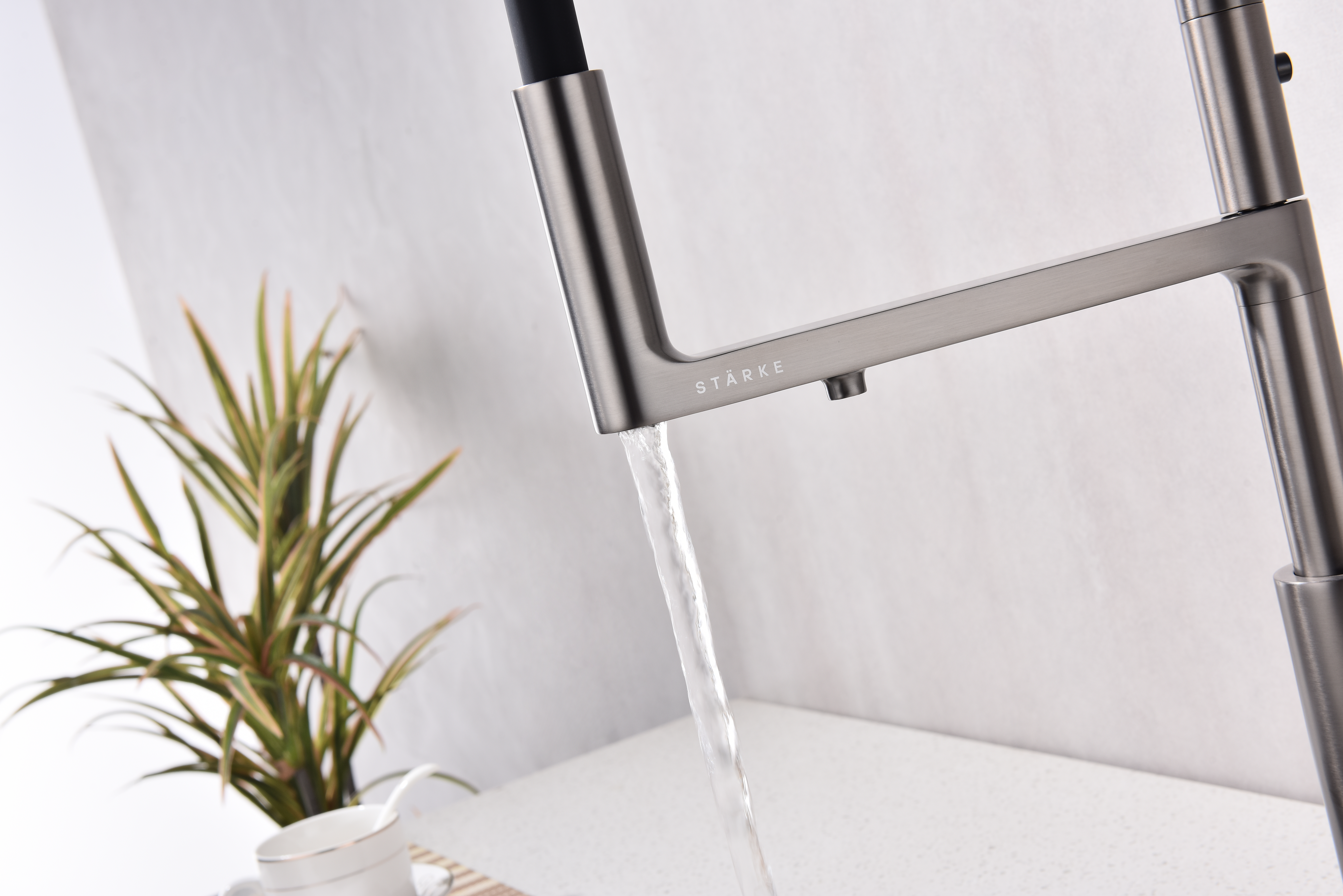 Многофункциональный смеситель для кухни TORNADO – модель премиальной серии «Starke» кухонной сантехники бренда Paulmark изготовлен из высококачественной латуни, которая отвечает высочайшим европейским стандартам качества, не содержит свинца, не разрушается со временем и безопасна для здоровья.