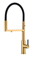Гибкий силиконовый излив оснащен функцией деликатного душа и магнитным механизмом фиксации в задней части латунного корпуса. Он позволяет ополоснуть посуду или мойку в любой ее части или наполнить емкости даже на столе рядом с мойкой.