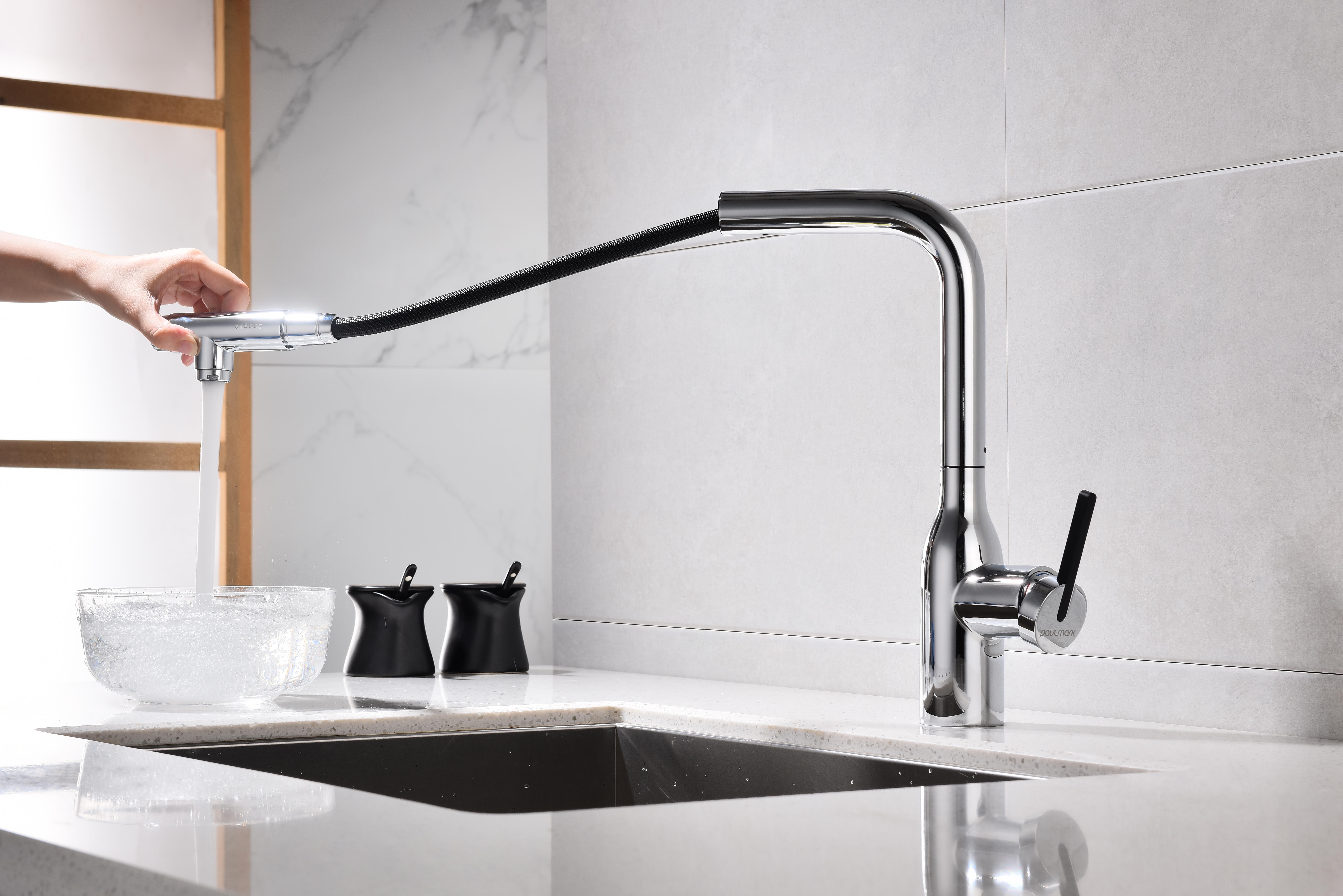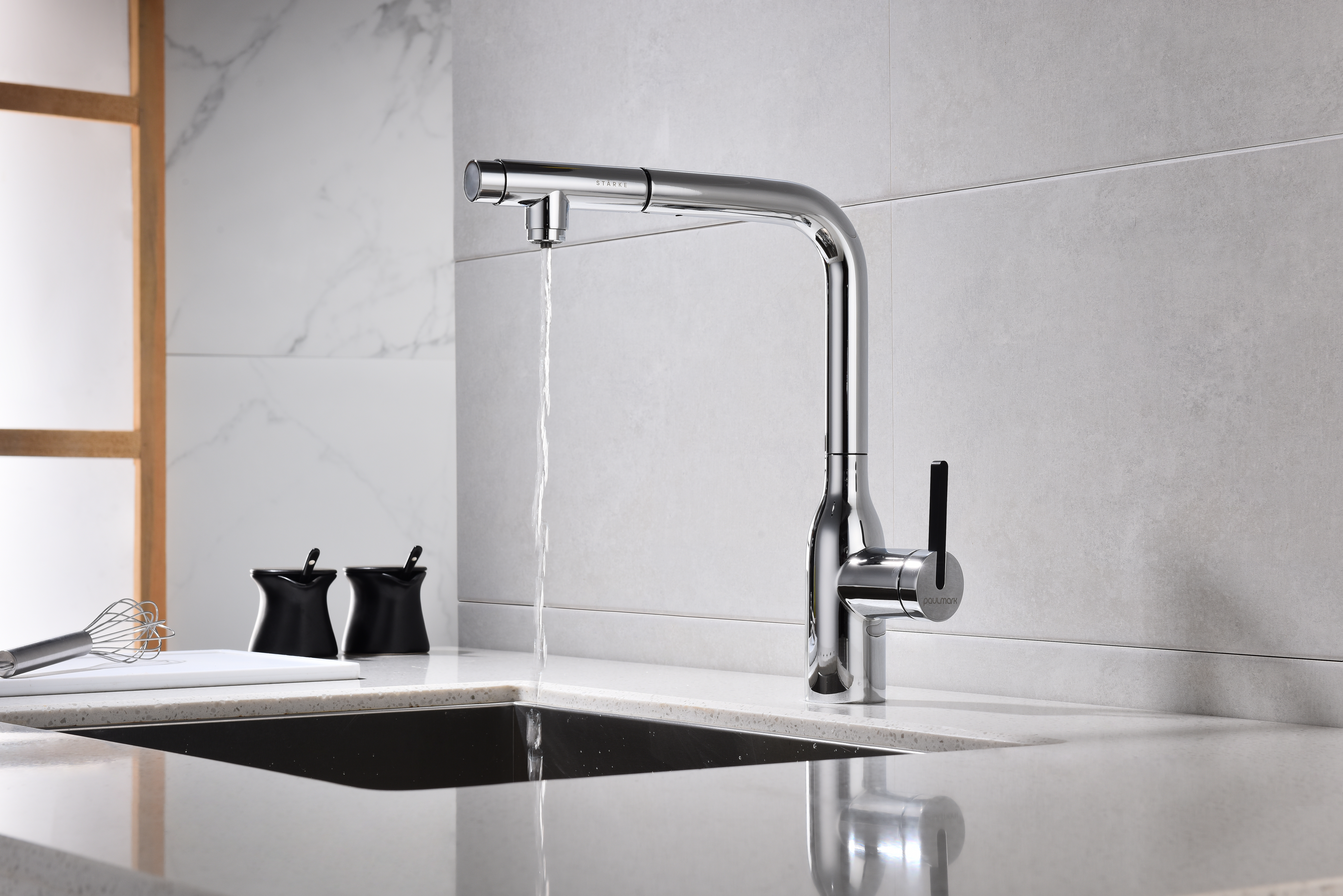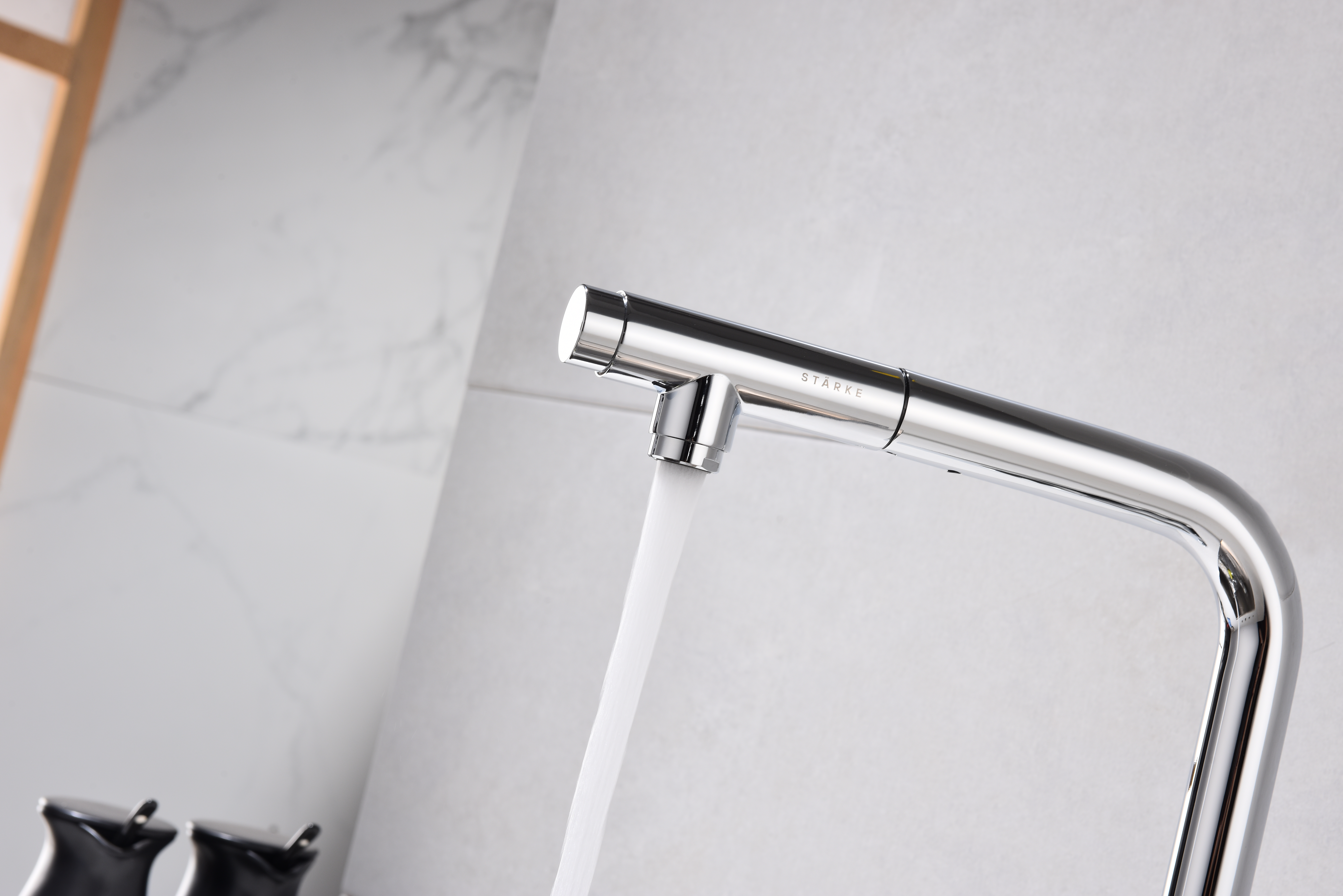 Высокий Г-образный излив с функцией вращения на 360 градусов обеспечивает удобство использования. Выдвижная часть излива способна обеспечить максимально комфортную эксплуатацию и экономный расход воды.