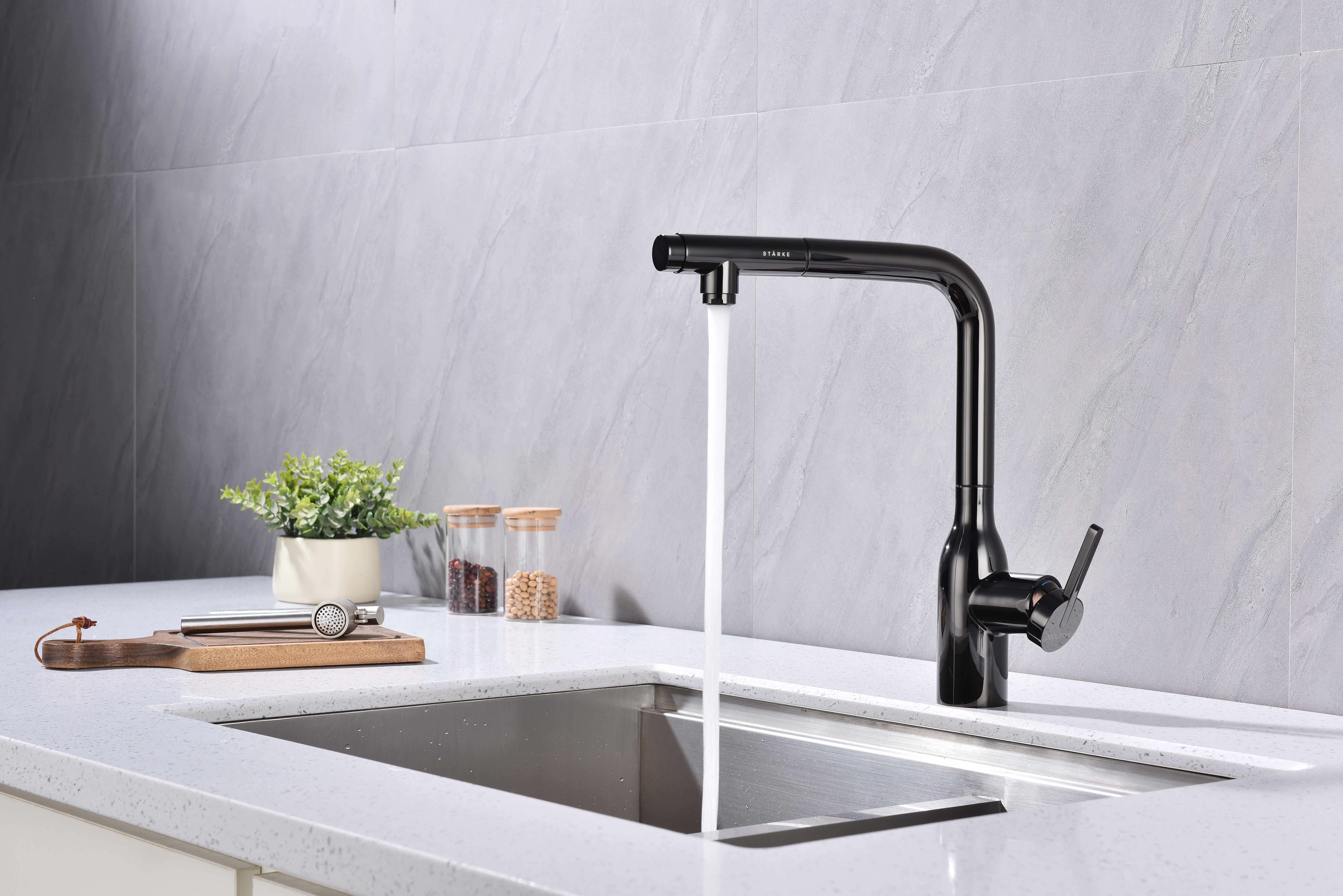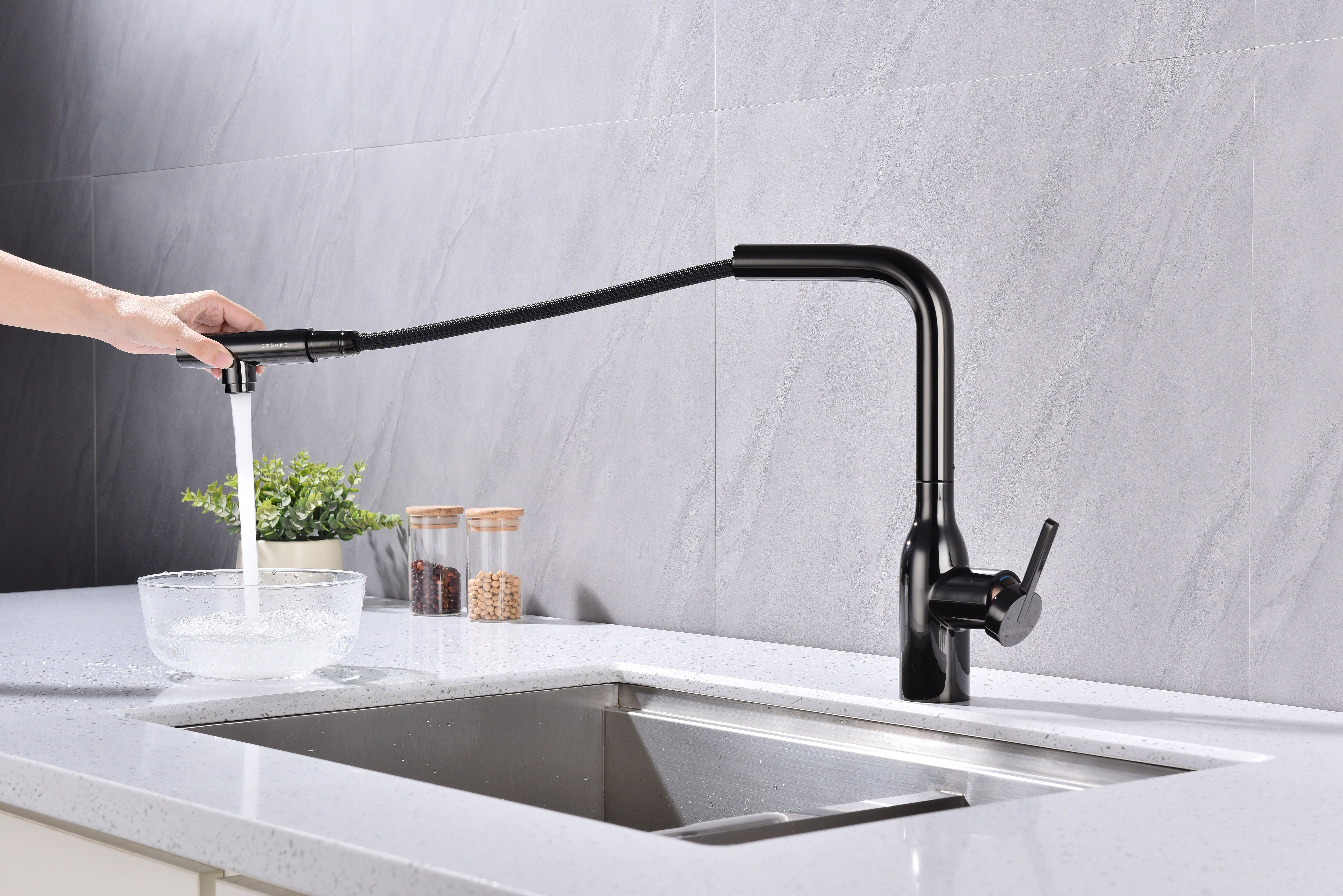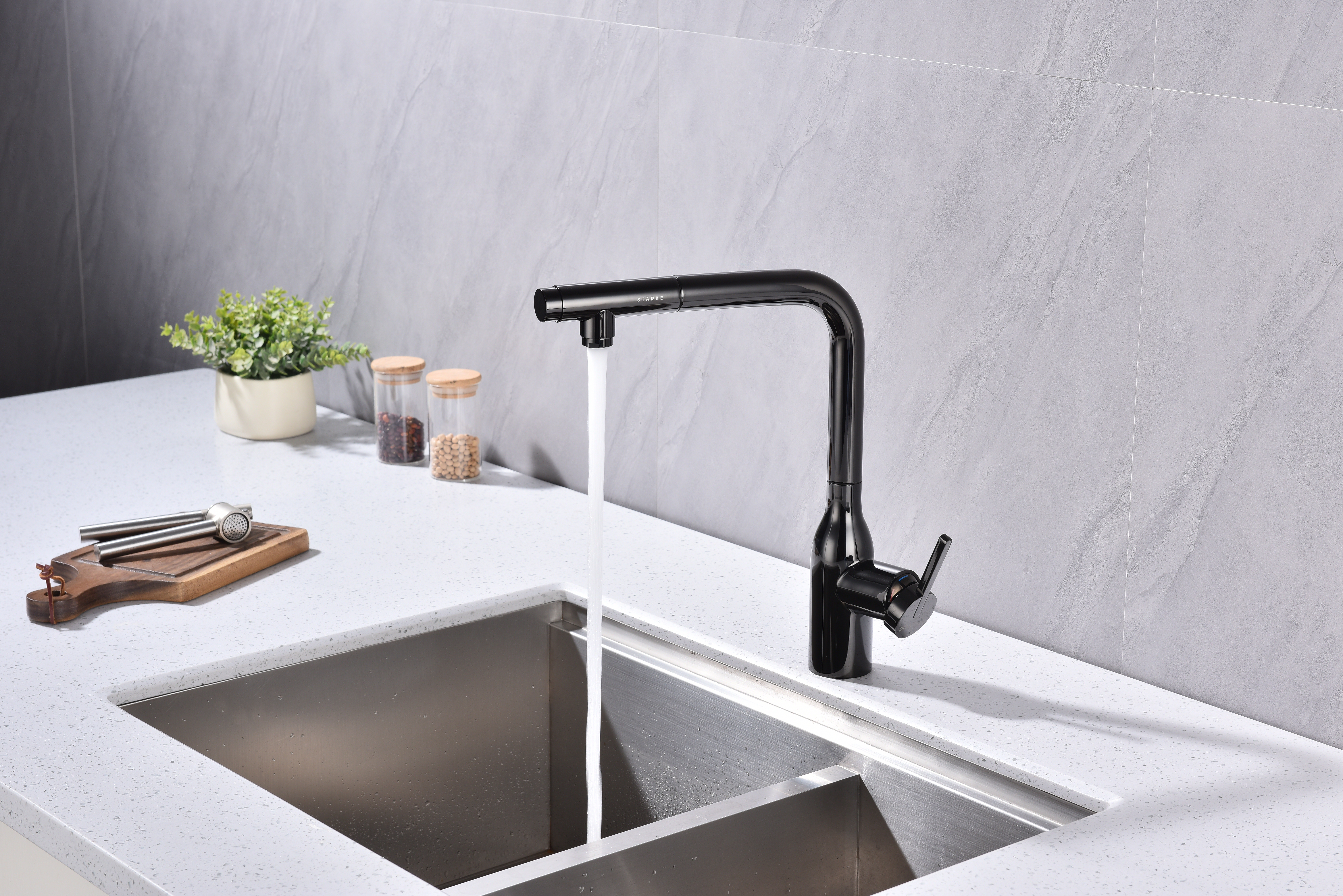 Высокий Г-образный излив с функцией вращения на 360 градусов обеспечивает удобство использования. Выдвижная часть излива способна обеспечить максимально комфортную эксплуатацию и экономный расход воды.