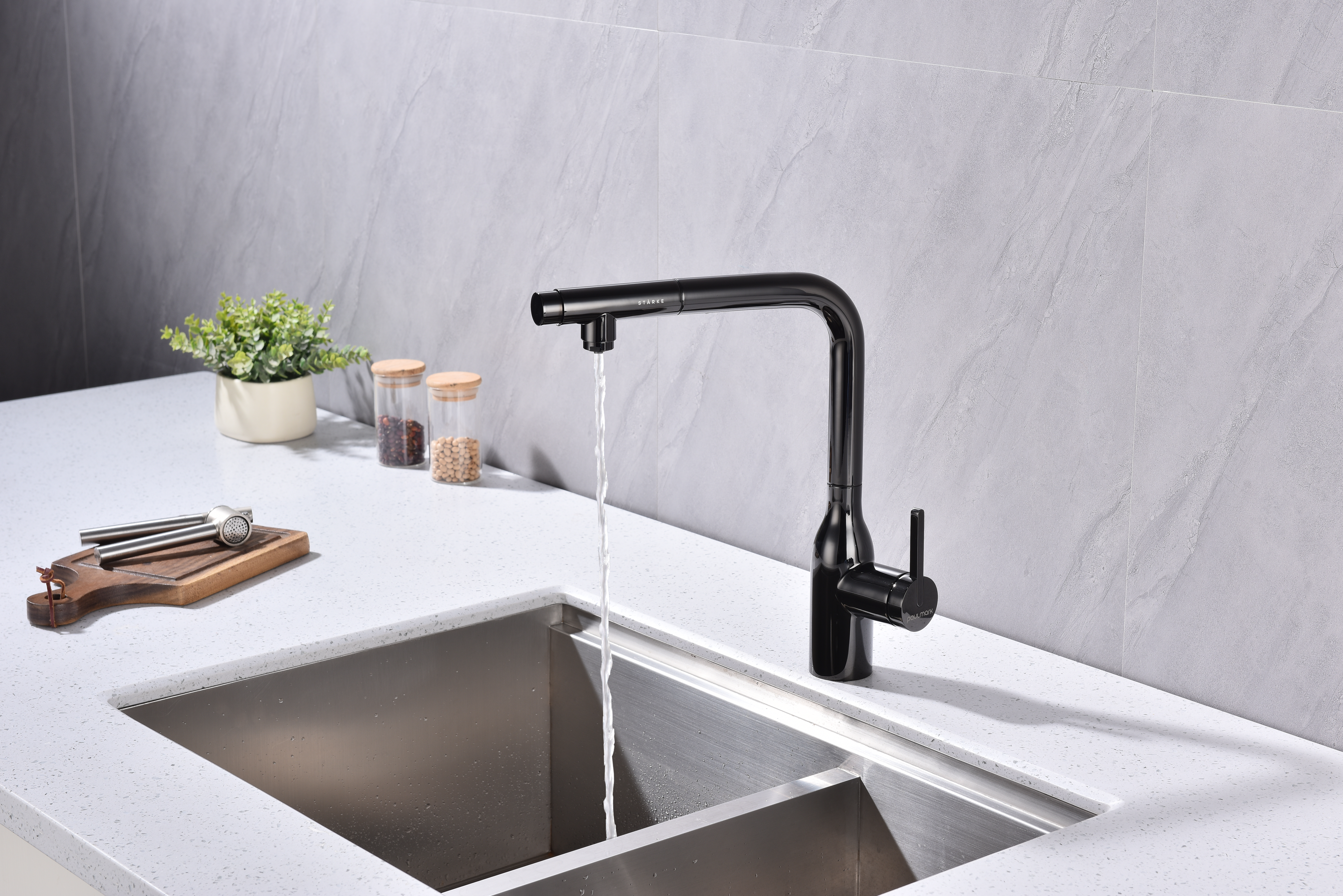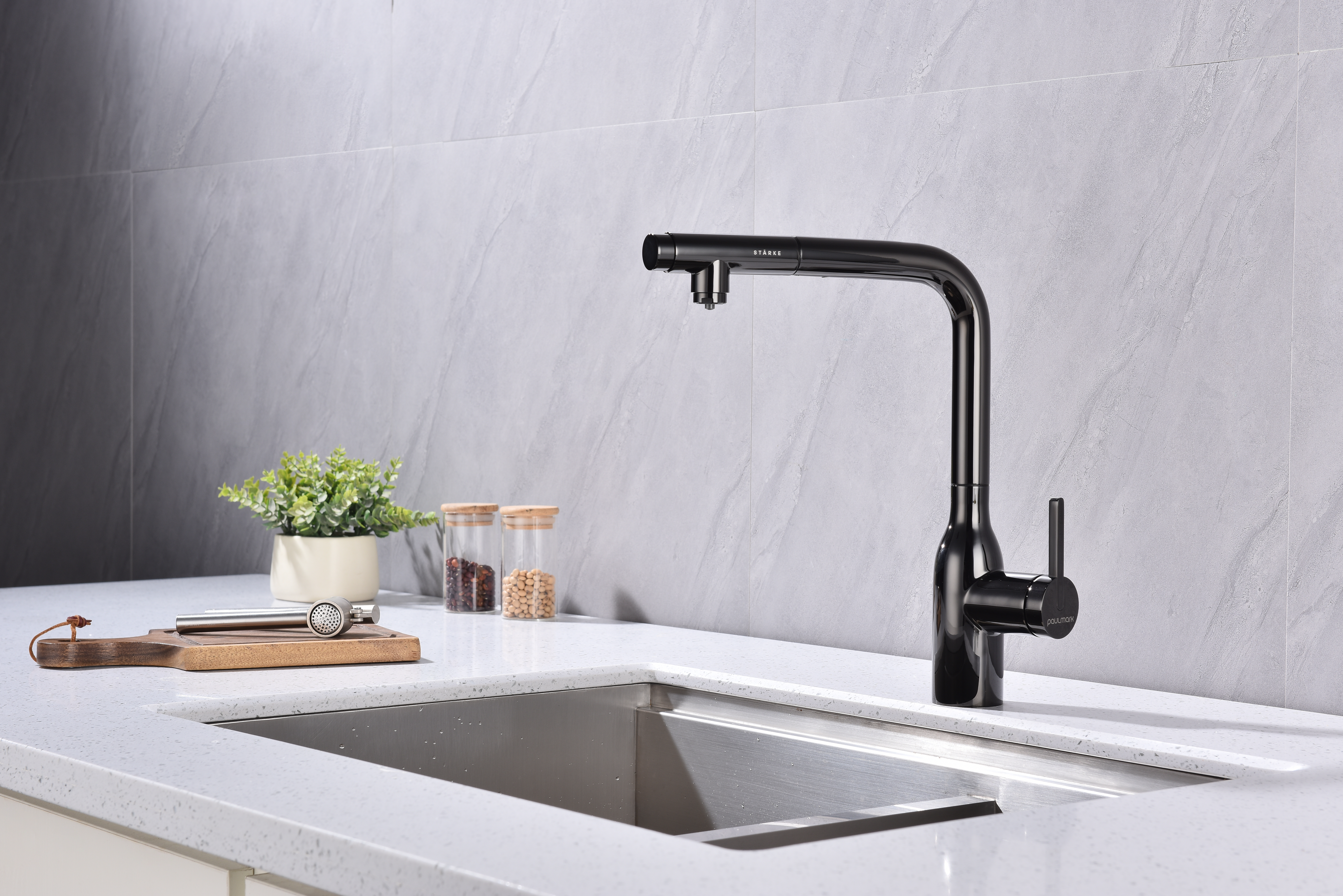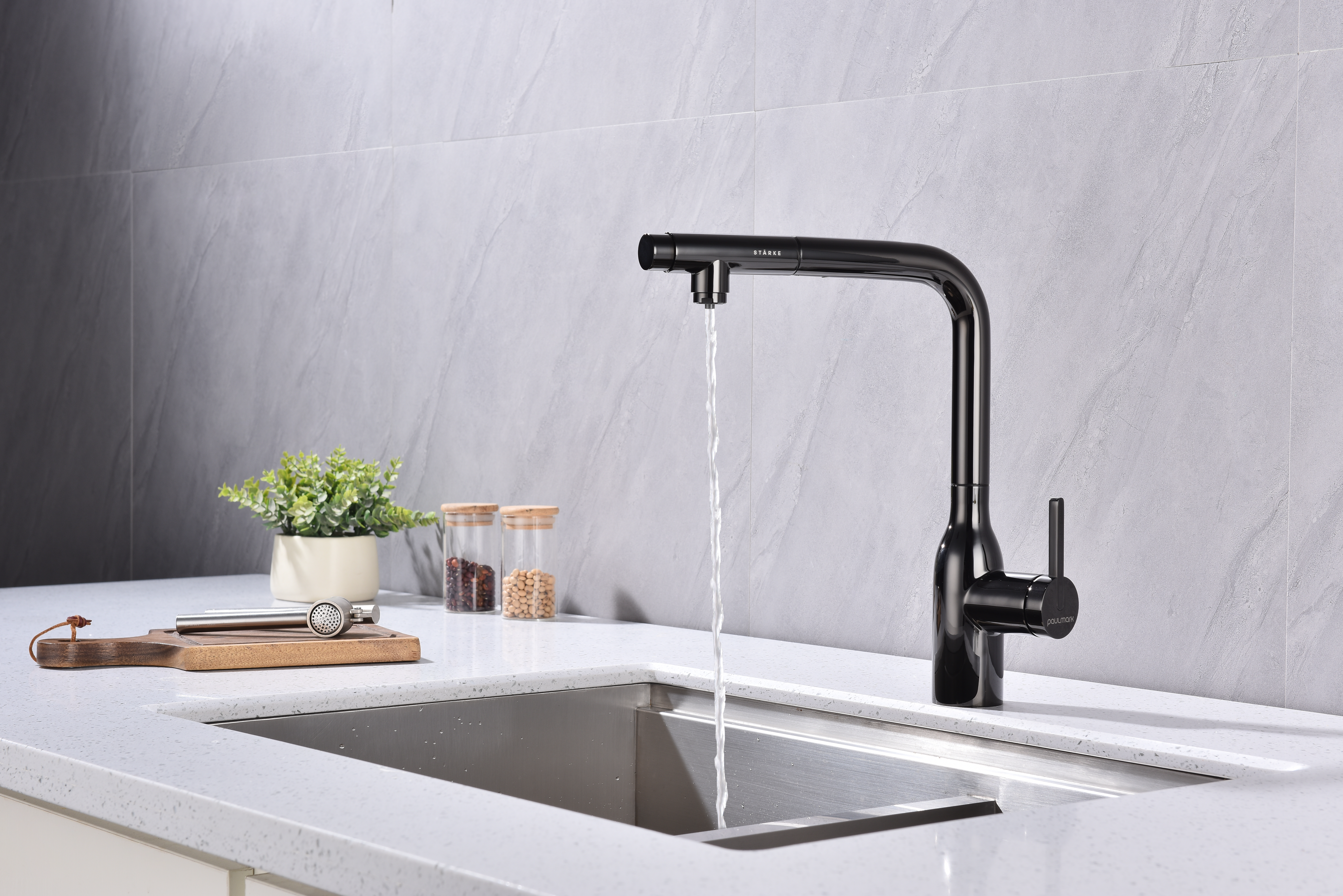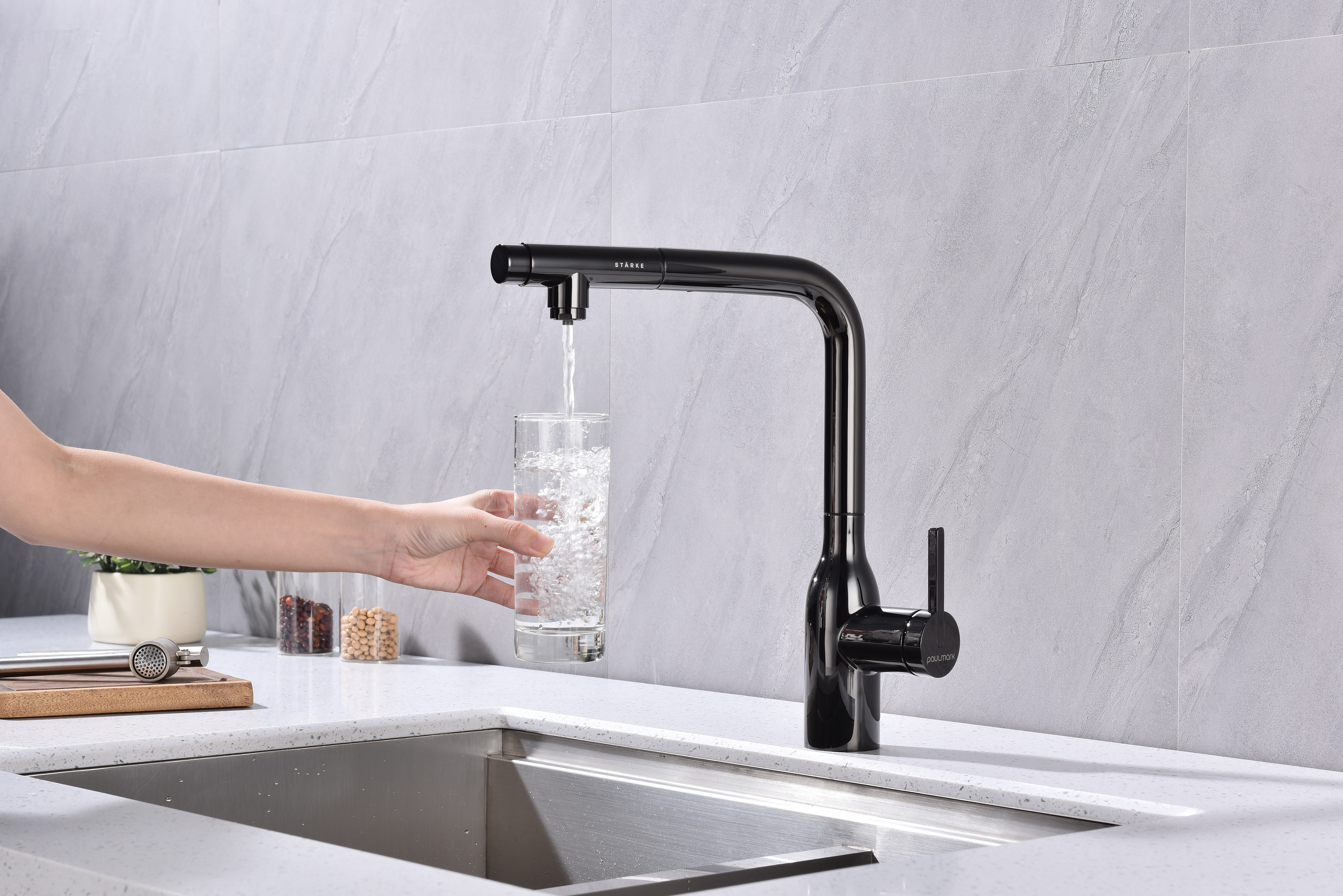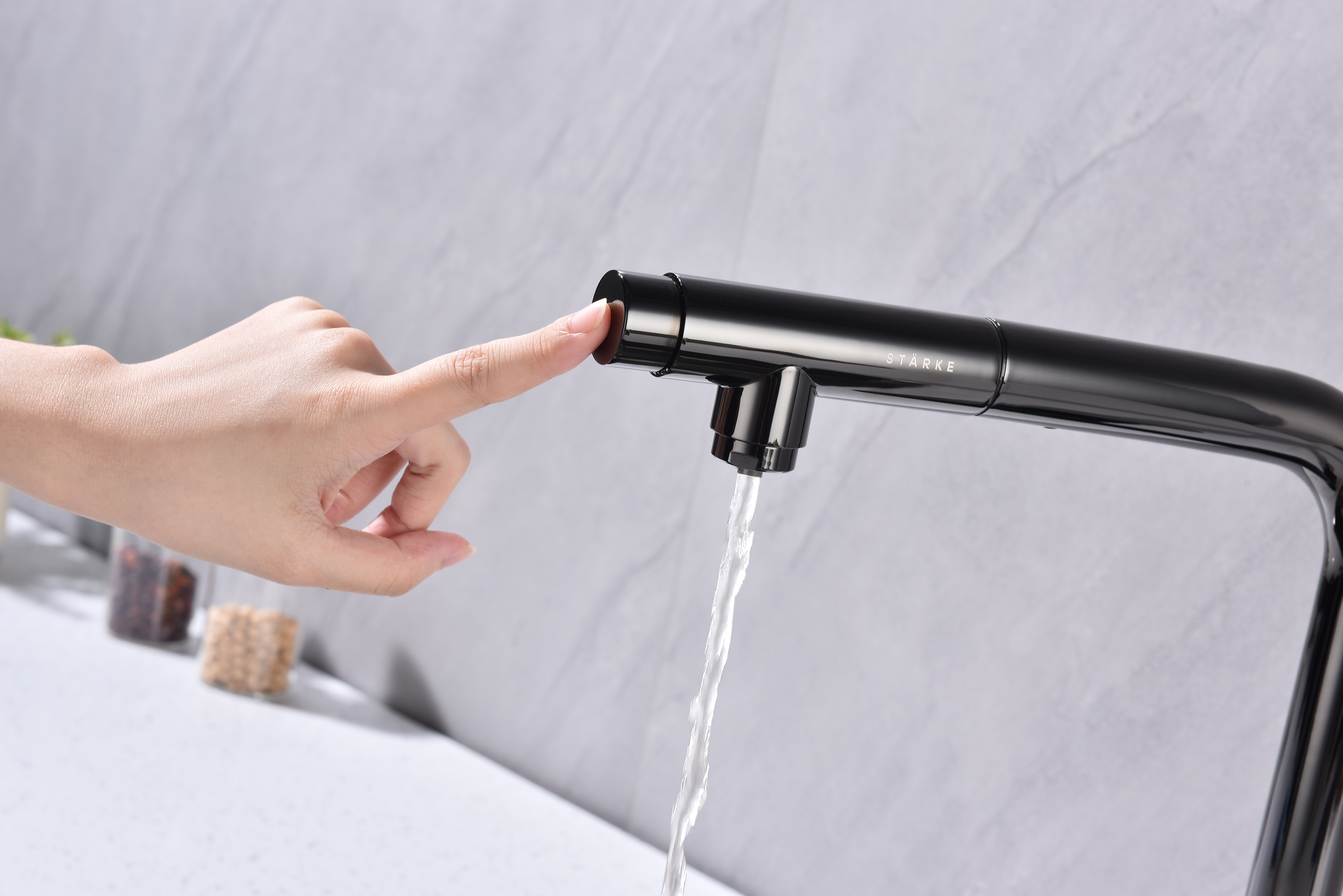 Смеситель VIPER имеет отдельный канал для питьевой воды. Переключение режимов осуществляется с помощью удобной и эргономично расположенной кнопки. Благодаря такому функционалу, потоки воды не смешиваются, а переключение осуществляется максимально комфортно.