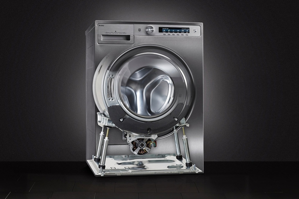 Вся конструкция размещена внутри корпуса и обеспечивает отжим на высоких оборотах практически без вибраций. Конструкция исключительно надежна и увеличивает срок службы машины. Бак и барабан сделаны из нержавеющей стали для улучшения гигиены.