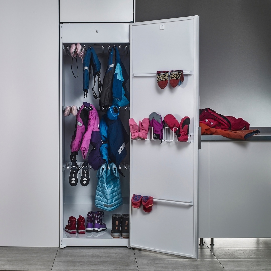 Сушильный шкаф ASKO — незаменимый помощник в доме в период холодов и сырой погоды. В нем можно разместить столько вещей, сколько помещается на бельевой веревке длиной в 16 метров! Удобные вешалки, положение и конфигурацию которых можно легко изменить в зависимости от ситуации, специальная полка для обуви и вешалка для перчаток, расположенные на внутренней дверце, позволяют быстро высушить или просто проветрить белье и верхнюю одежду.Сушильный шкаф ASKO можно использовать для быстрой сушки одежды, спортивной экипировки, различных аксессуаров (шапок, перчаток, шарфов), обуви, отсыревшей от активных занятий спортом, или работы на открытом воздухе в холодное время года.